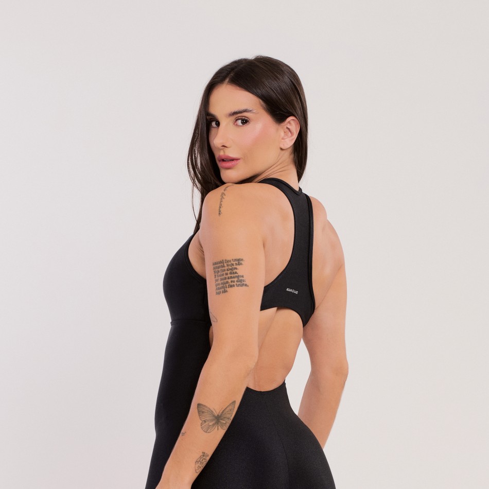 Macacão em poliamida na cor preta, com decote nadador que une estilo esportivo e funcionalidade. Confeccionado em tecido de alta compressão, oferece excelente sustentação e modelagem ao corpo, sem abrir mão do conforto. O modelo nadador garante liberdade total de movimentos e valoriza a parte superior do corpo, enquanto o decote nas costas adiciona um toque moderno e sofisticado. Possui bojo removível, permitindo diferentes formas de uso conforme sua preferência.