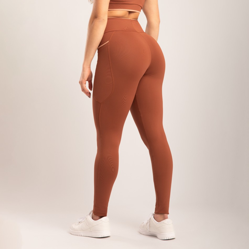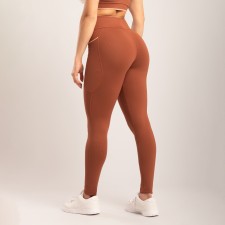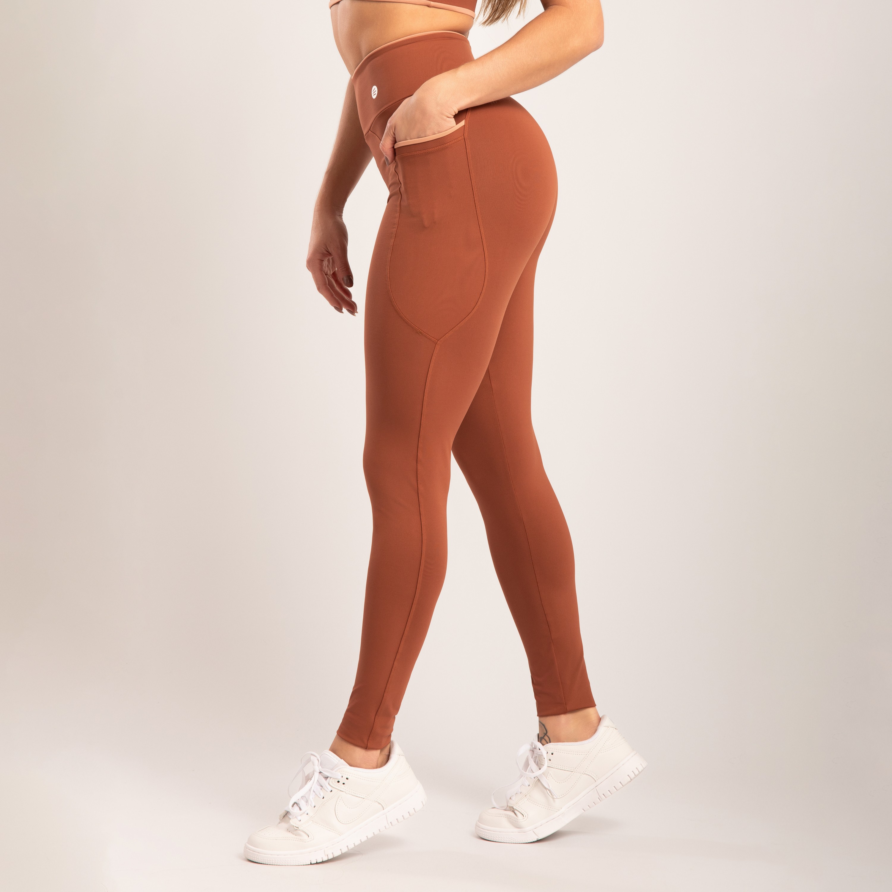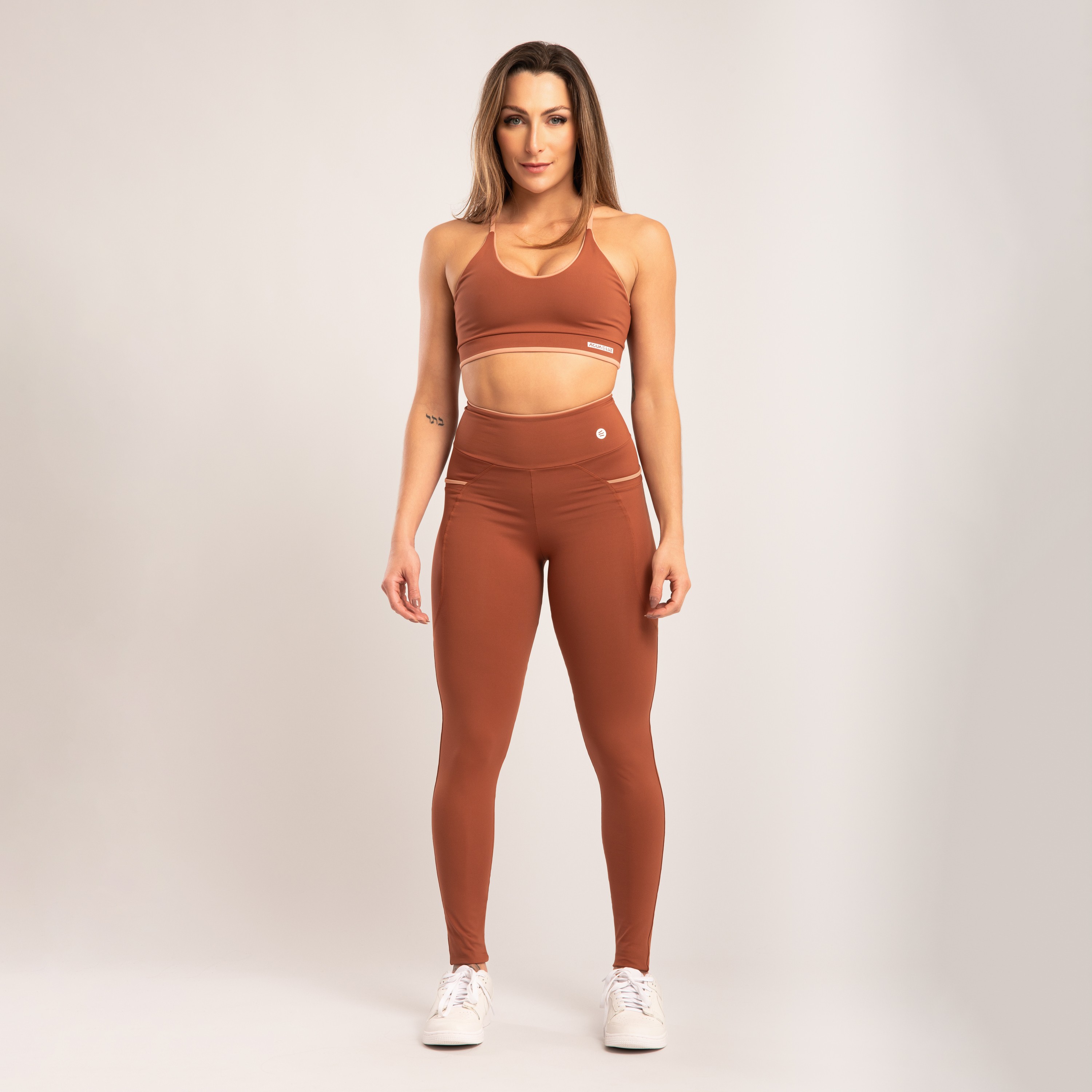 Calça legging em poliamida opaca na cor marrom claro, com bolsos laterais funcionais e detalhe nude que cria um recorte bicolor moderno e elegante. Confeccionada em poliamida de alta qualidade, oferece toque macio e secagem rápida, garantindo firmeza e conforto durante o uso. A cintura alta proporciona ajuste seguro ao corpo, enquanto o contraste marrom e nude valoriza a silhueta com estilo e sofisticação.