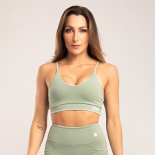 Top Comfort em poliamida opaca na cor verde chá, com detalhe em verde aloe que destaca o recorte anatômico e o contorno contrastante, criando um visual moderno e marcante. Possui alças delicadas e decote em V nas costas, garantindo leveza, conforto e liberdade de movimentos. Confeccionado em poliamida de toque macio e secagem rápida, oferece compressão média e ajuste perfeito ao corpo. Conta com bojo removível, permitindo adaptação conforme seu estilo e necessidade.