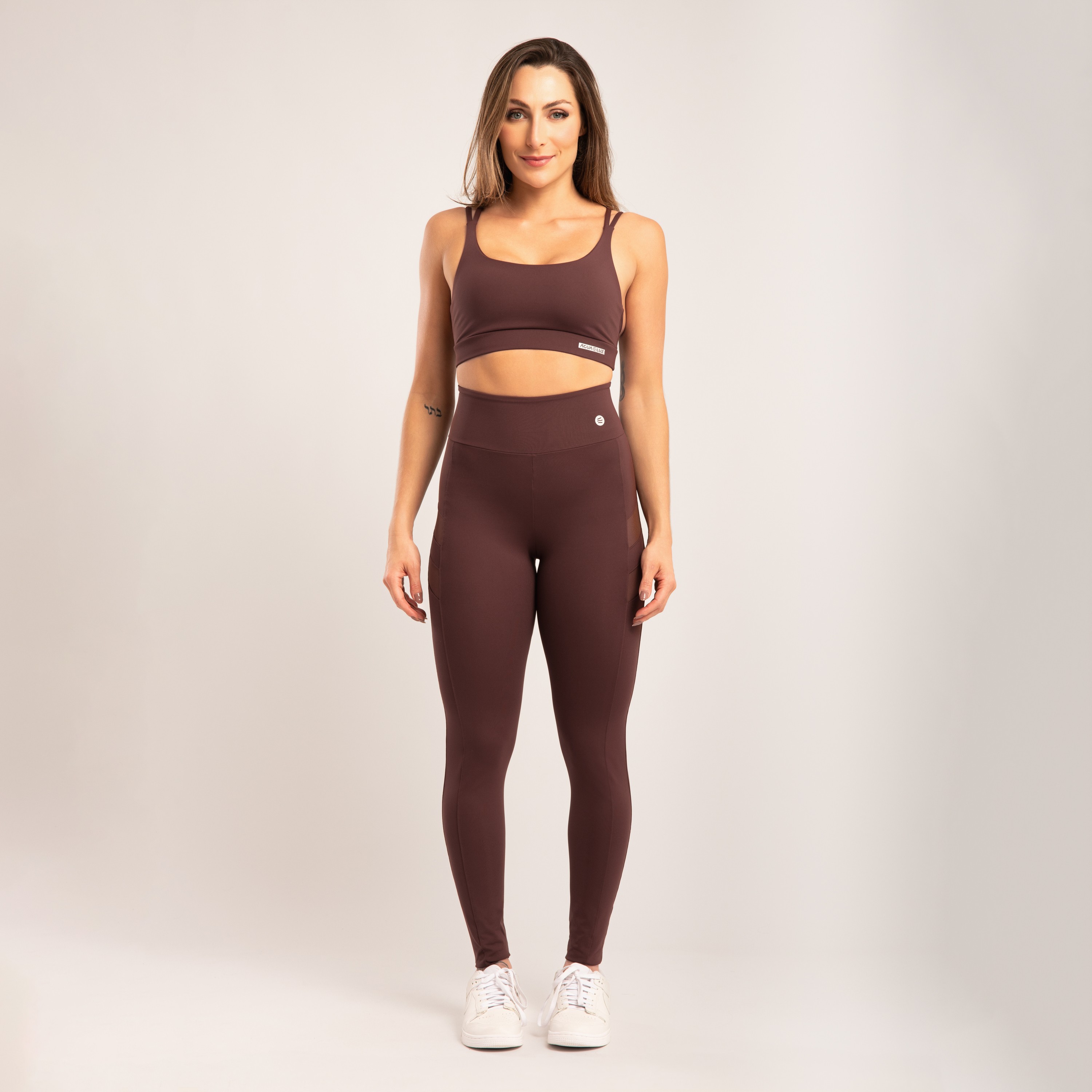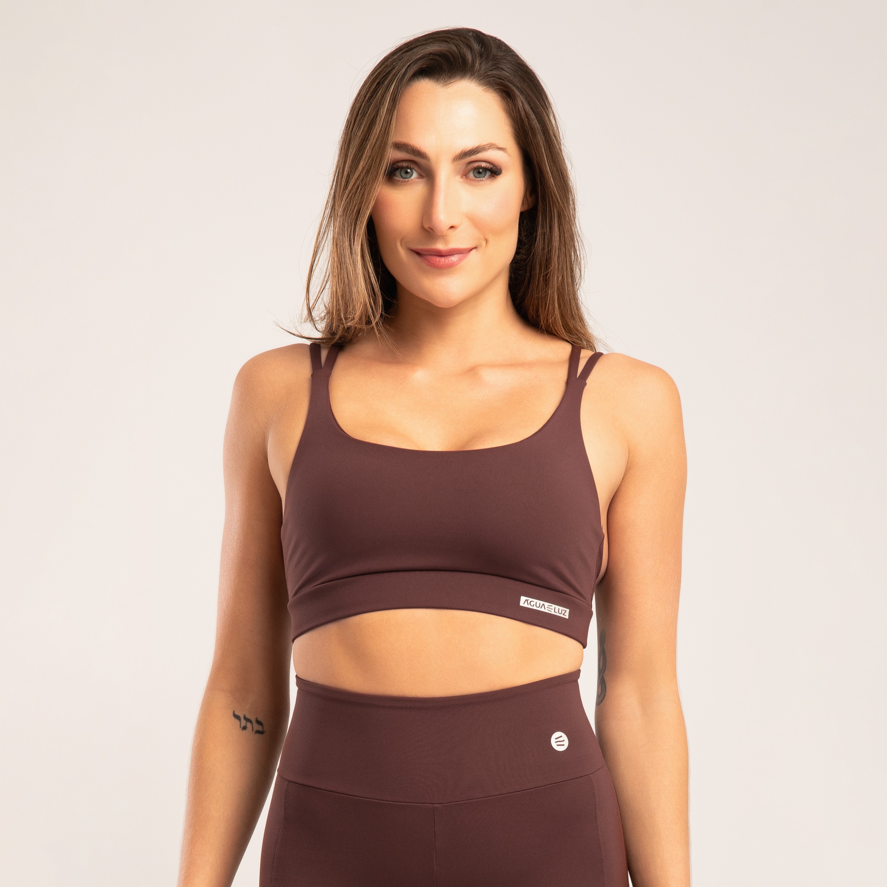 Com design em alça dupla, este top marrom escuro combina visual moderno e sustentação confortável. A modelagem com maior cobertura garante segurança e elegância, enquanto a poliamida opaca oferece toque macio, secagem rápida e excelente ajuste ao corpo. Possui bojo removível, permitindo adaptação conforme a preferência, ideal para treinos ou para compor looks versáteis no dia a dia.