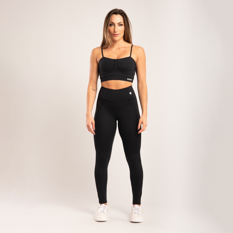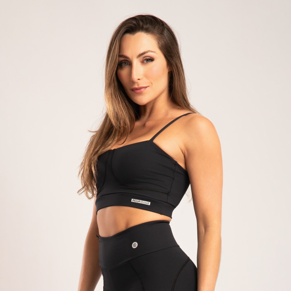 Conforto e estilo se encontram neste top preto com modelagem tipo camiseta. Confeccionado em poliamida opaca de alta qualidade, possui toque macio, secagem rápida e caimento ajustado ao corpo. O detalhe em pesponto adiciona um toque moderno à peça, enquanto o bojo removível garante mais liberdade e versatilidade no uso.