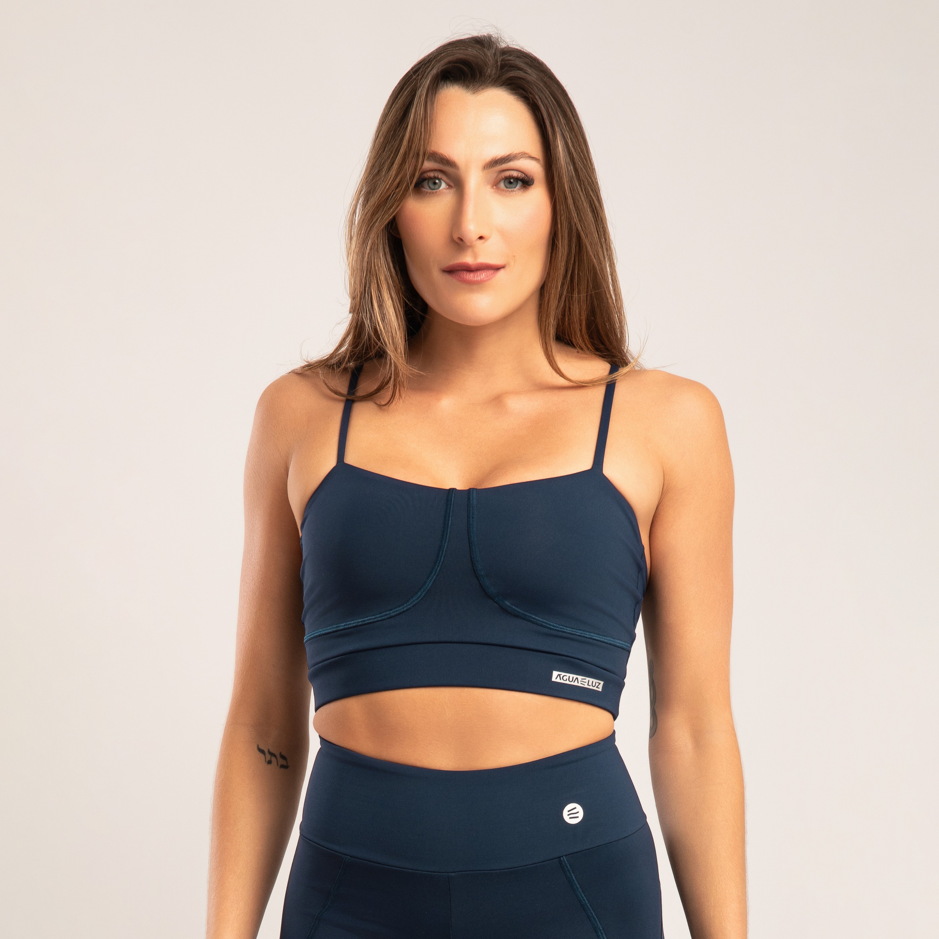 Conforto e estilo se encontram neste top azul marinho com modelagem tipo camiseta. Confeccionado em poliamida opaca de alta qualidade, possui toque macio, secagem rápida e caimento ajustado ao corpo. O pesponto aparente adiciona um toque moderno à peça, enquanto o bojo removível garante mais liberdade e versatilidade no uso.