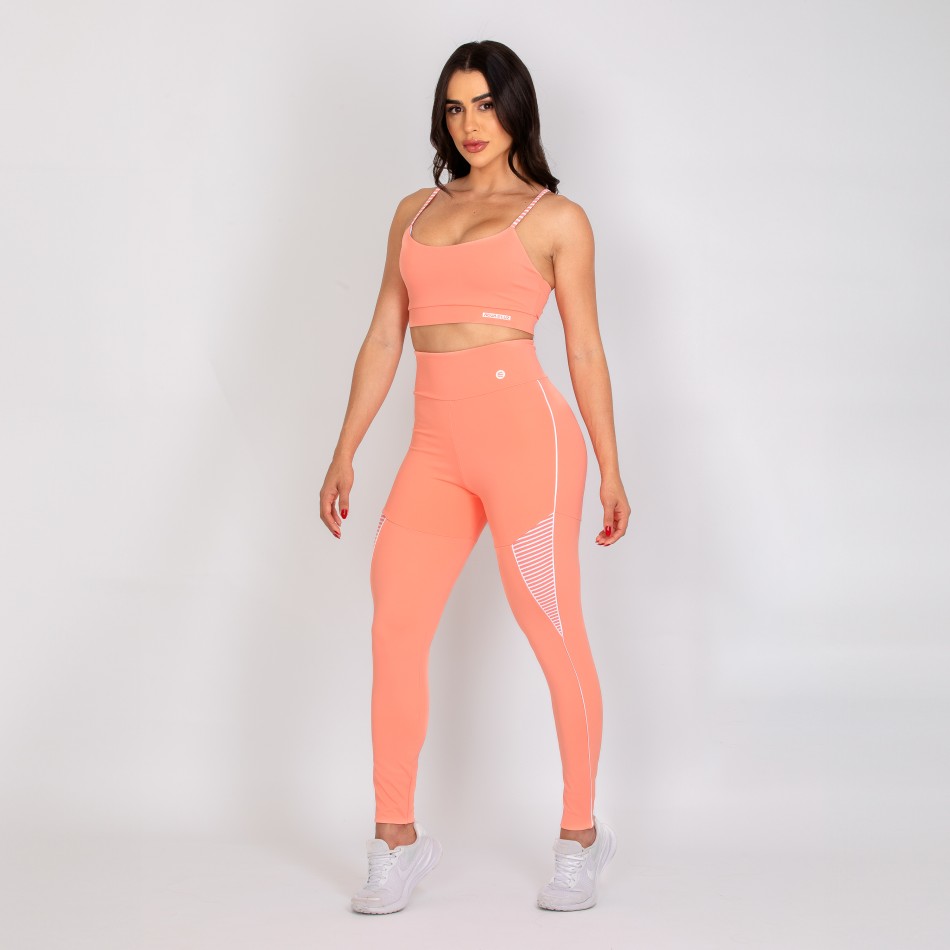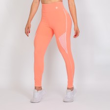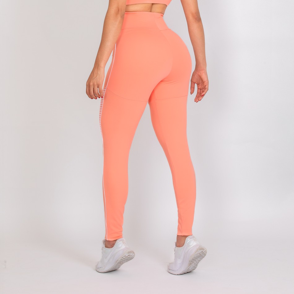 Calça legging feminina com forro, confeccionada em poliamida na cor Pêssego. O modelo possui cós alto anatômico e design moderno, com detalhes laterais em listras e vivo que valorizam as linhas do corpo e destacam a silhueta de forma elegante.