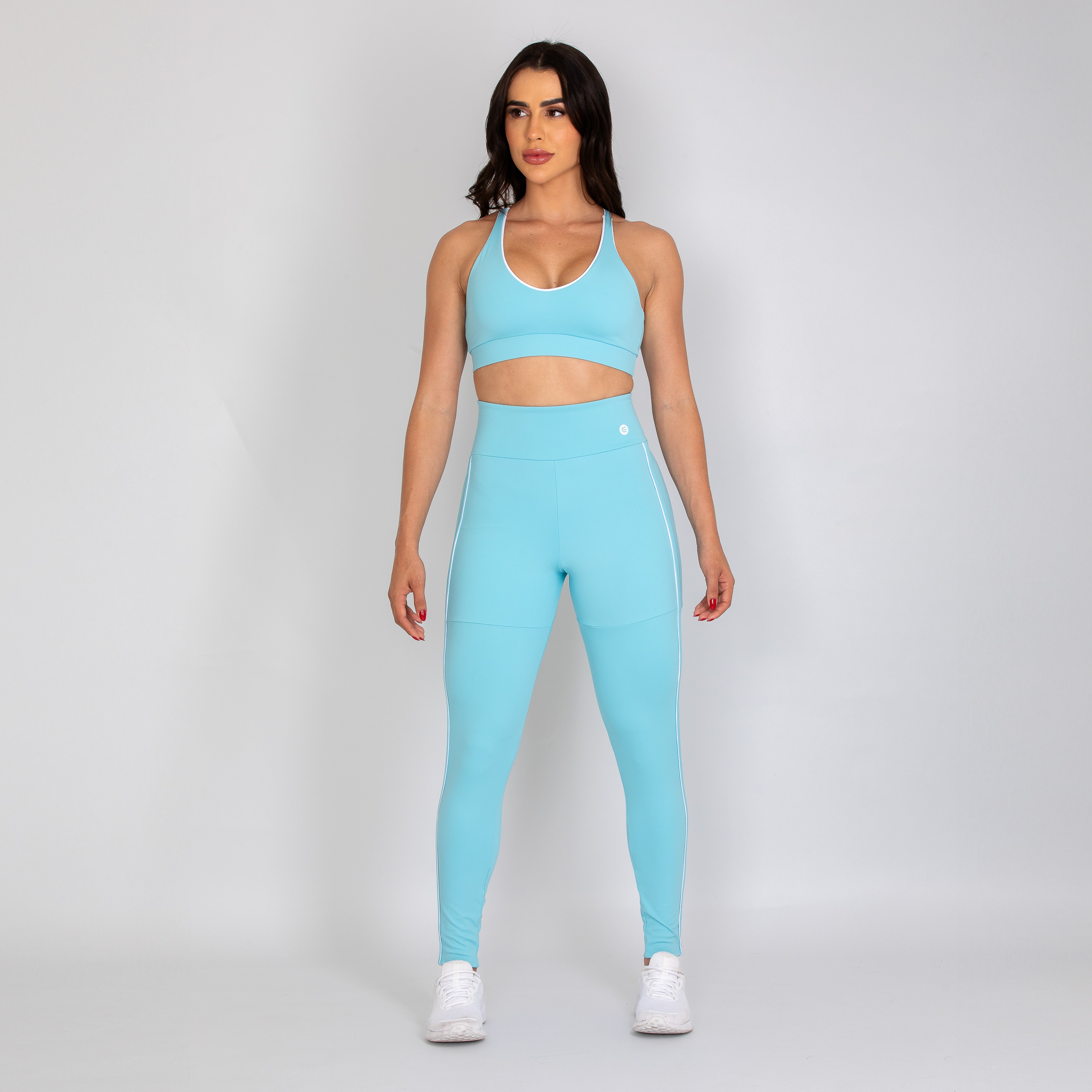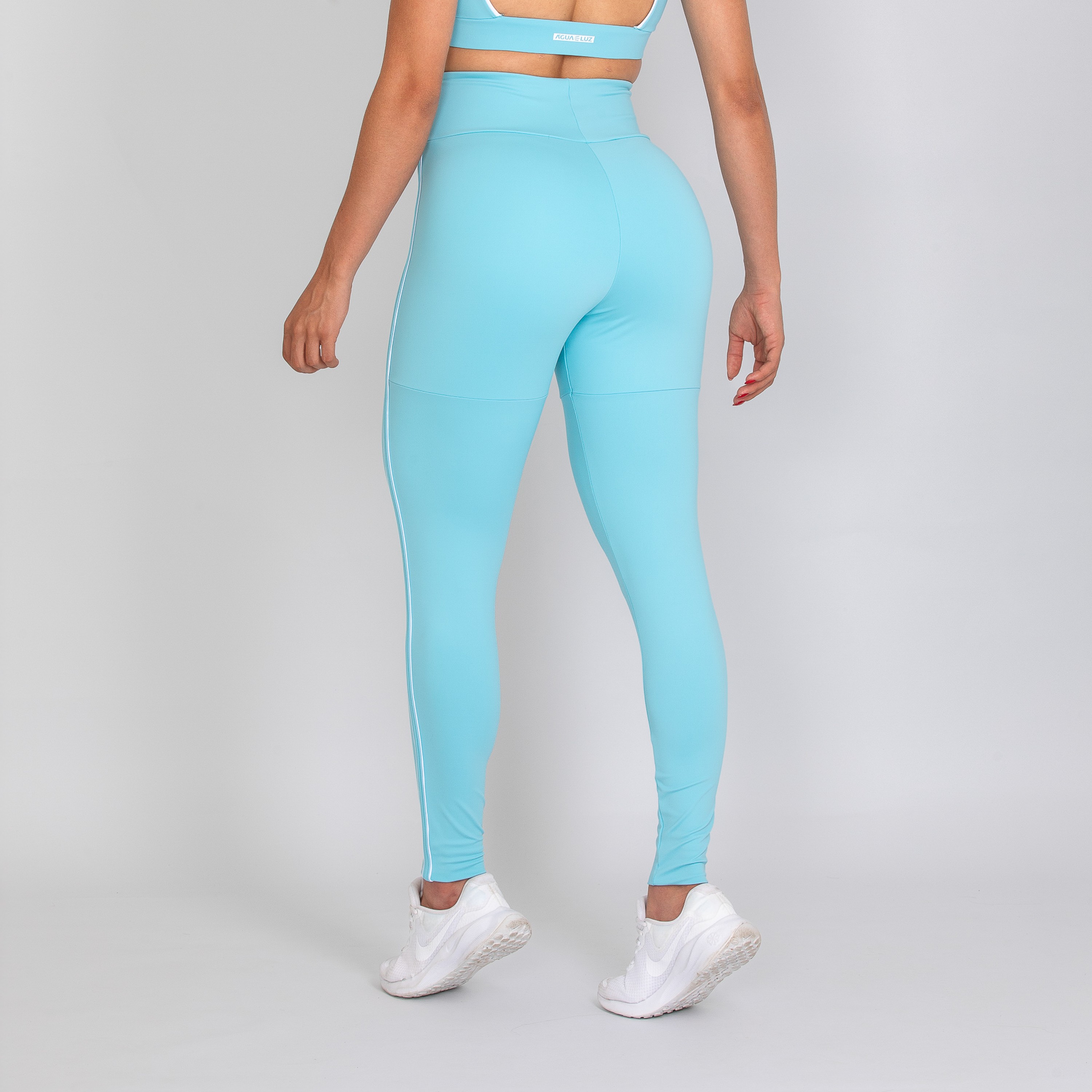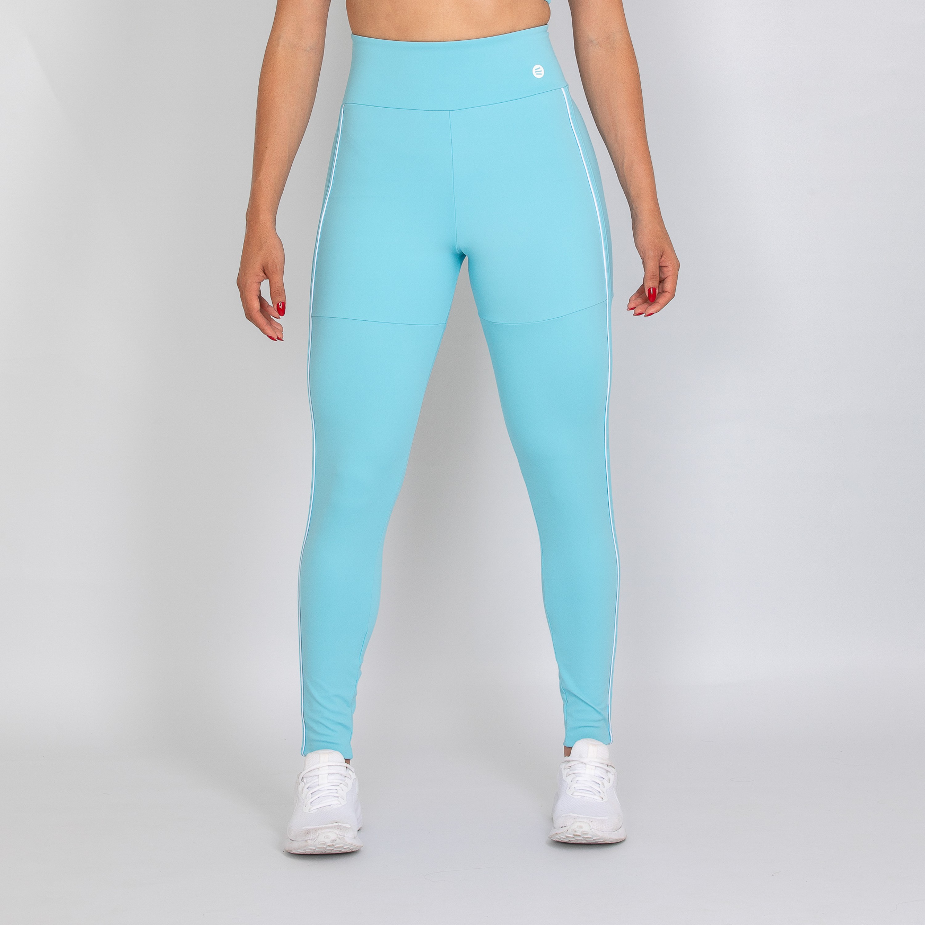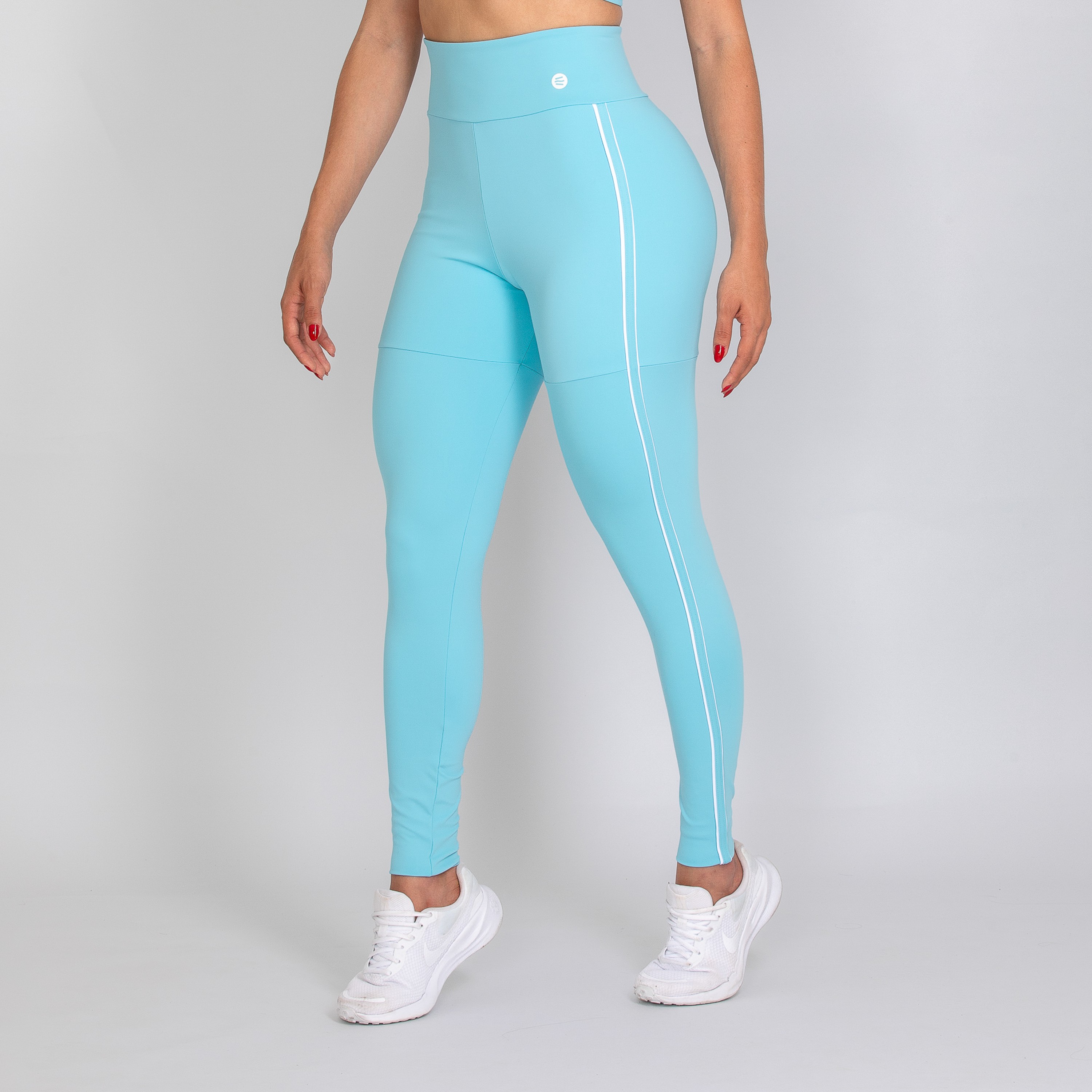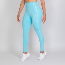 Calça legging feminina com forro, confeccionada em poliamida na cor azul bebê. O modelo possui cós alto anatômico e design moderno, com detalhes laterais em vivo na cor branca que valorizam as linhas do corpo e destacam a silhueta de forma elegante.
