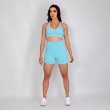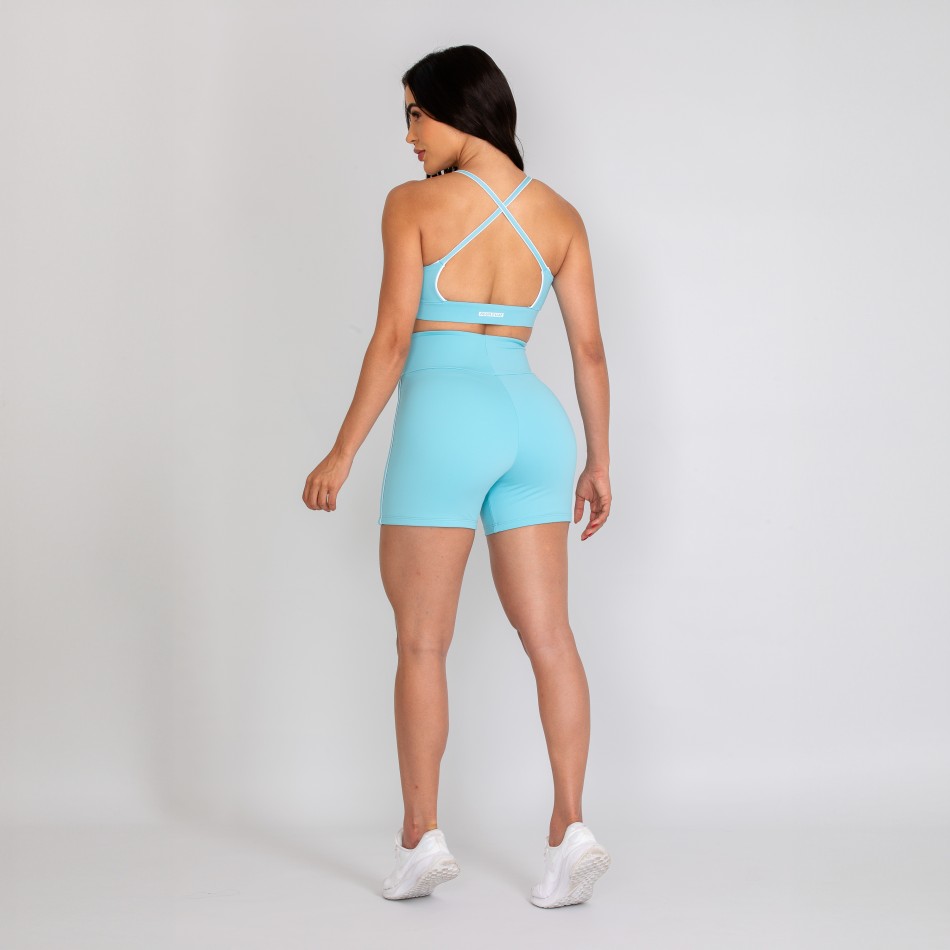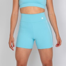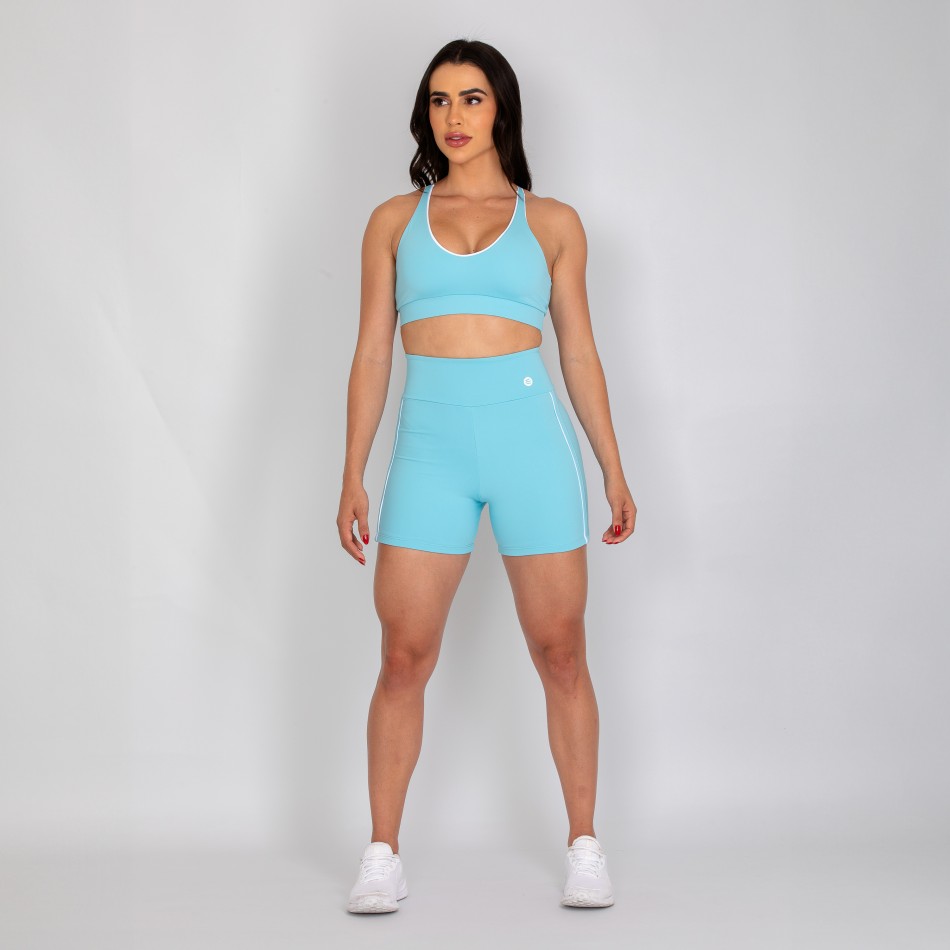 Short feminino com forro, confeccionado em poliamida na cor azul bebê. O modelo possui cós alto anatômico e design moderno, com detalhes laterais em vivo na cor branca que valorizam as linhas do corpo e destacam a silhueta de forma elegante.