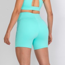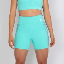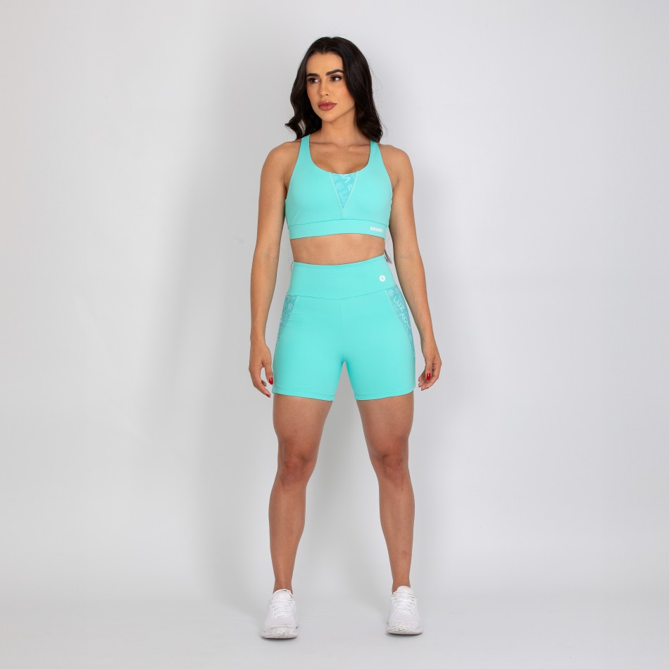 Short feminino com forro, confeccionado em poliamida na cor verde água. Com design moderno, a peça possui detalhes laterais em tela personalizada, que adicionam um toque sofisticado e exclusivo ao visual.