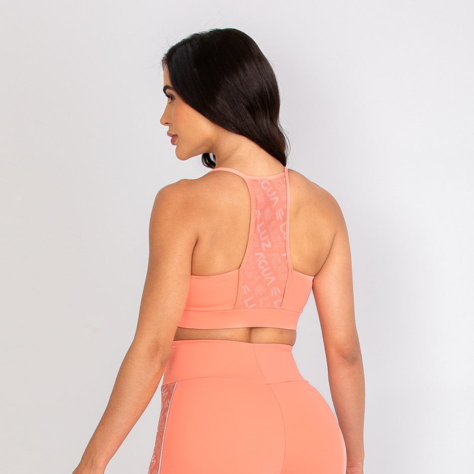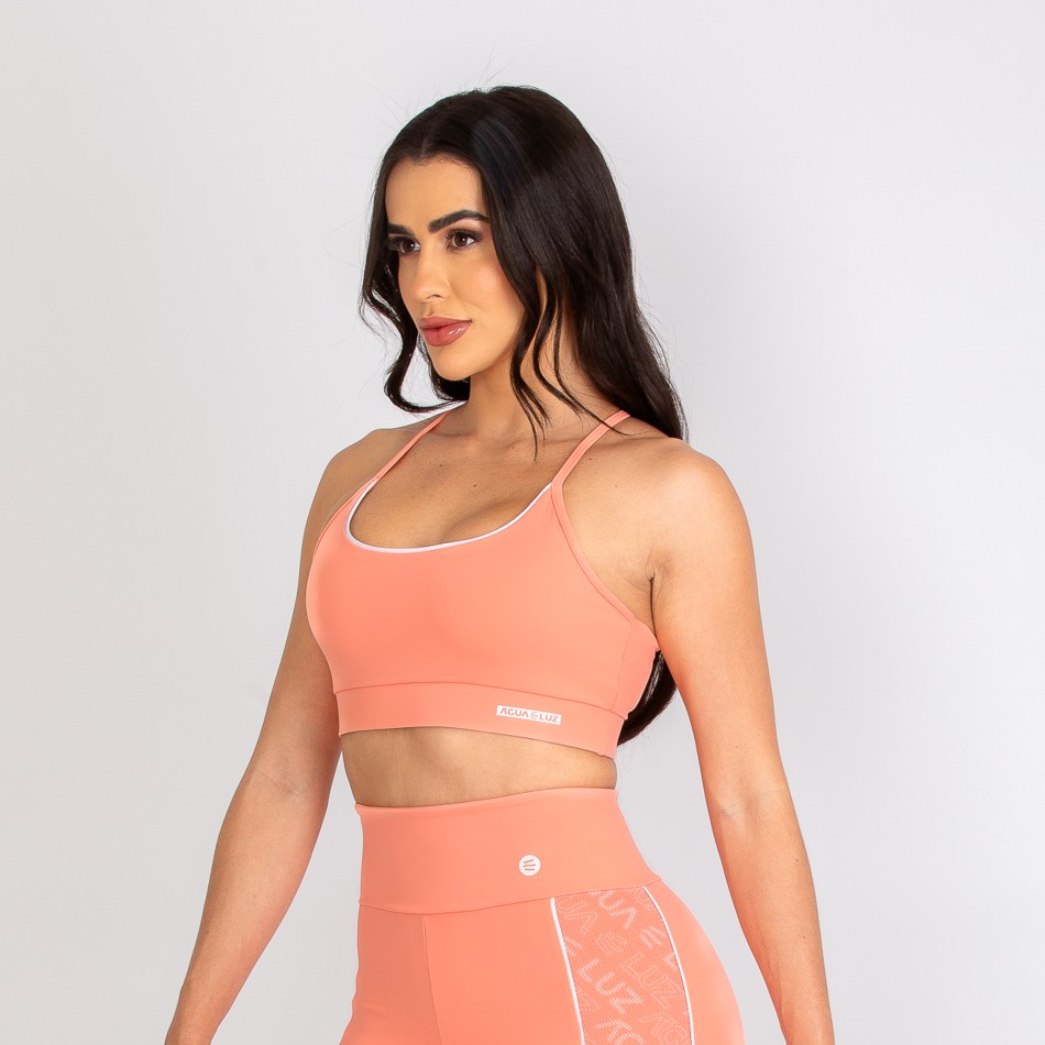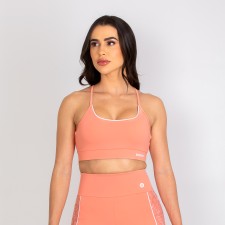 Top feminino modelo nadador, confeccionado em poliamida na cor pêssego. Com design moderno e funcional, possui detalhe em tela personalizada no nadador e contorno em branco no decote, valorizando o colo feminino e trazendo um toque sofisticado ao visual.