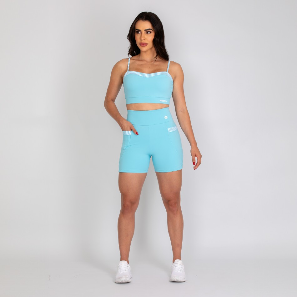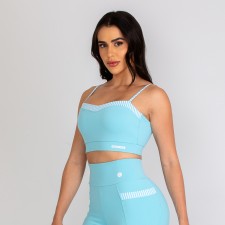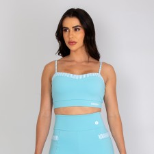 Top feminino estruturado, confeccionado em poliamida na cor azul bebê. O modelo possui alças finas com regulagem, proporcionando ajuste personalizado e confortável. Os detalhes em listras no decote e nas alças adicionam um toque moderno e sofisticado ao visual.