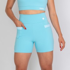 Short feminino com forro, confeccionado em poliamida na cor azul bebê. O modelo possui cós alto anatômico e design moderno, com bolsos funcionais com detalhe em listras, que adicionam um toque sofisticado ao visual e garantem praticidade para guardar chaves, celular ou fone durante os exercícios.
