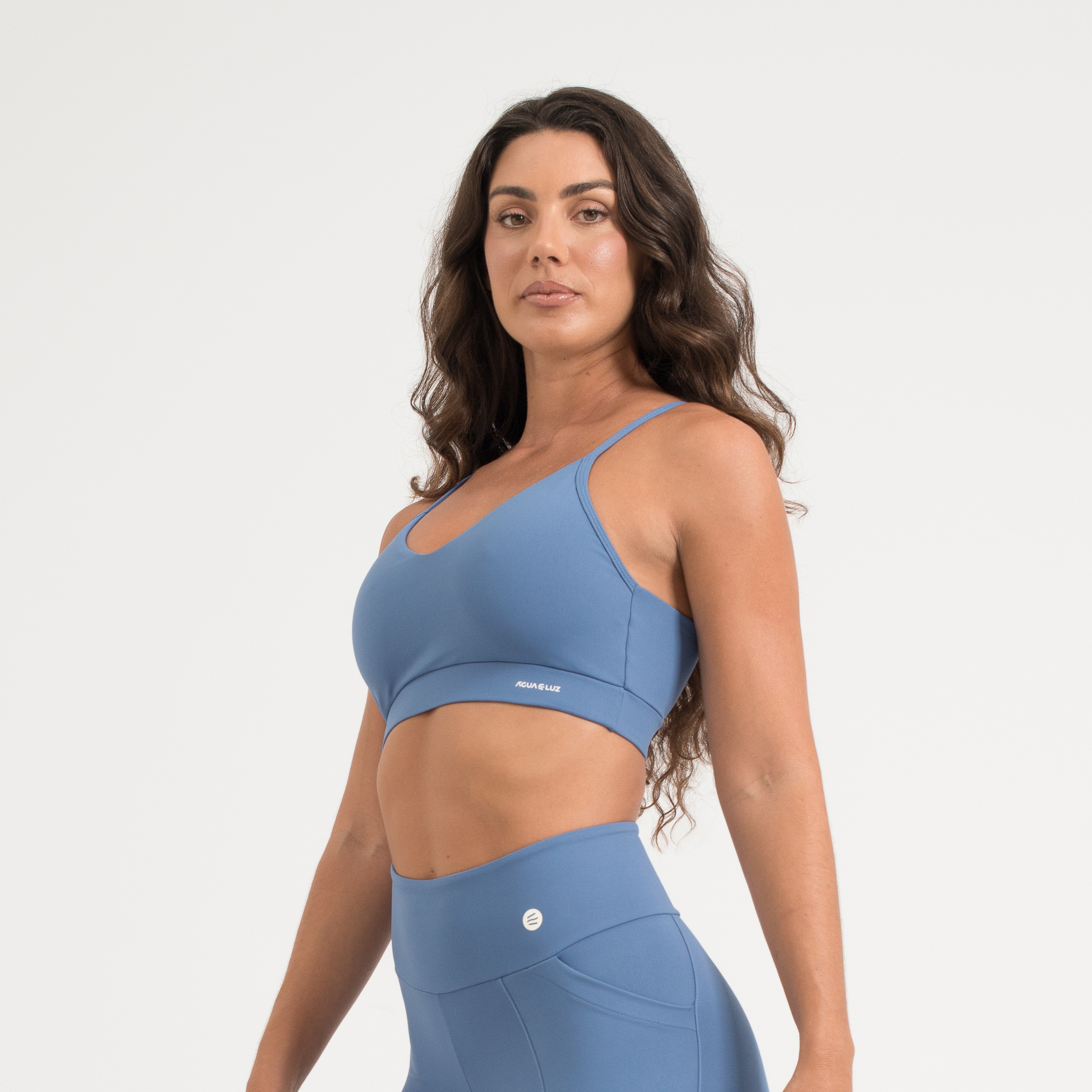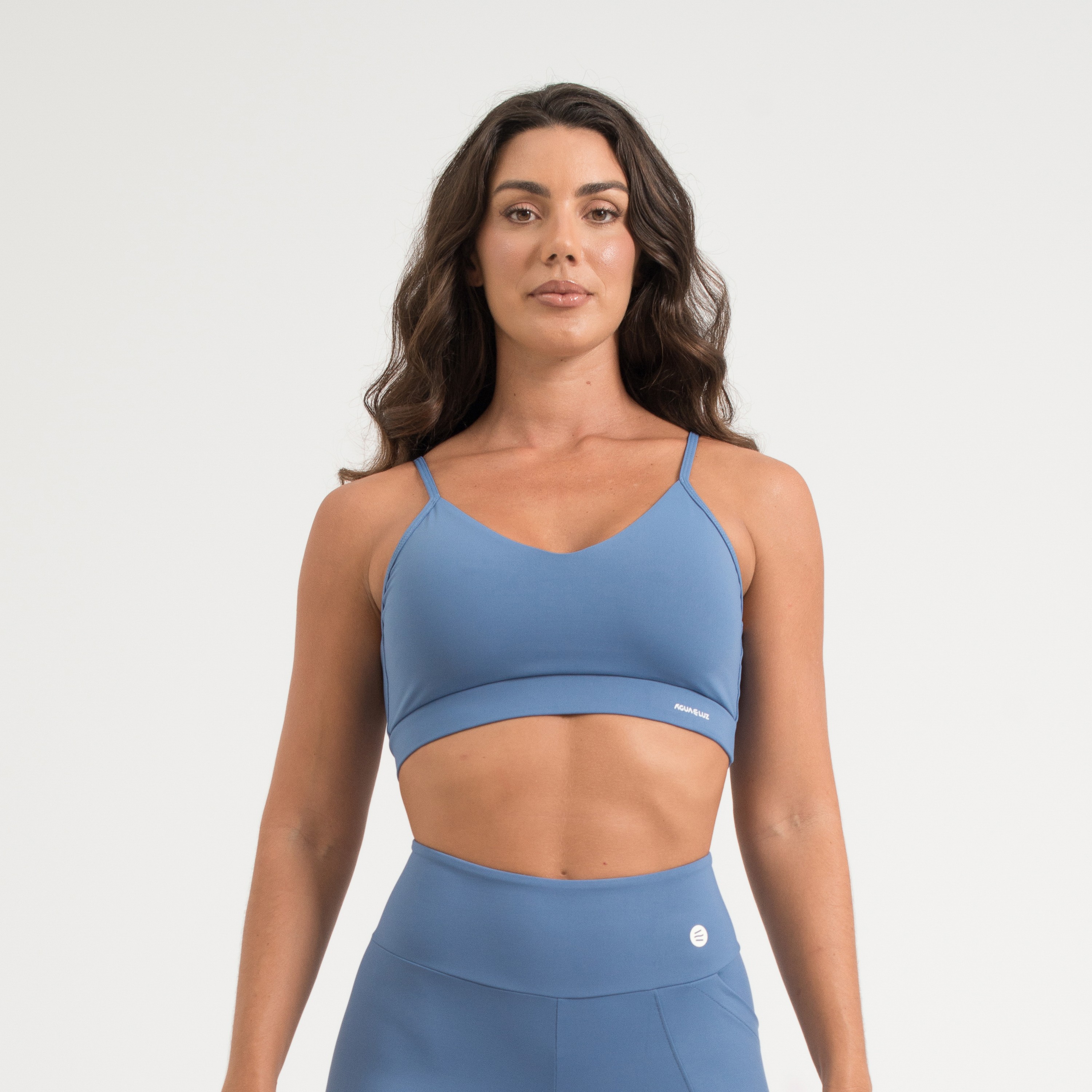 Top fitness confeccionado em poliamida de alta qualidade, que oferece conforto, durabilidade e toque macio ao vestir. Possui alças reguláveis, bojo removível e design moderno na cor azul sereno, ideal para o dia a dia ou atividades físicas.