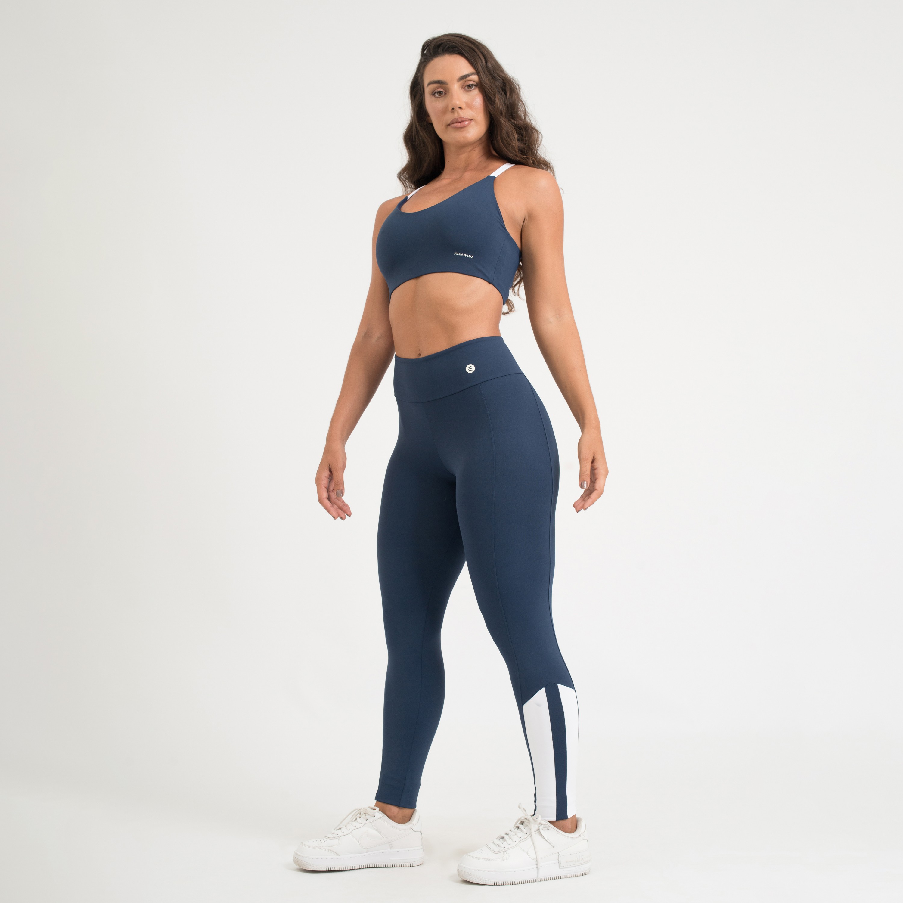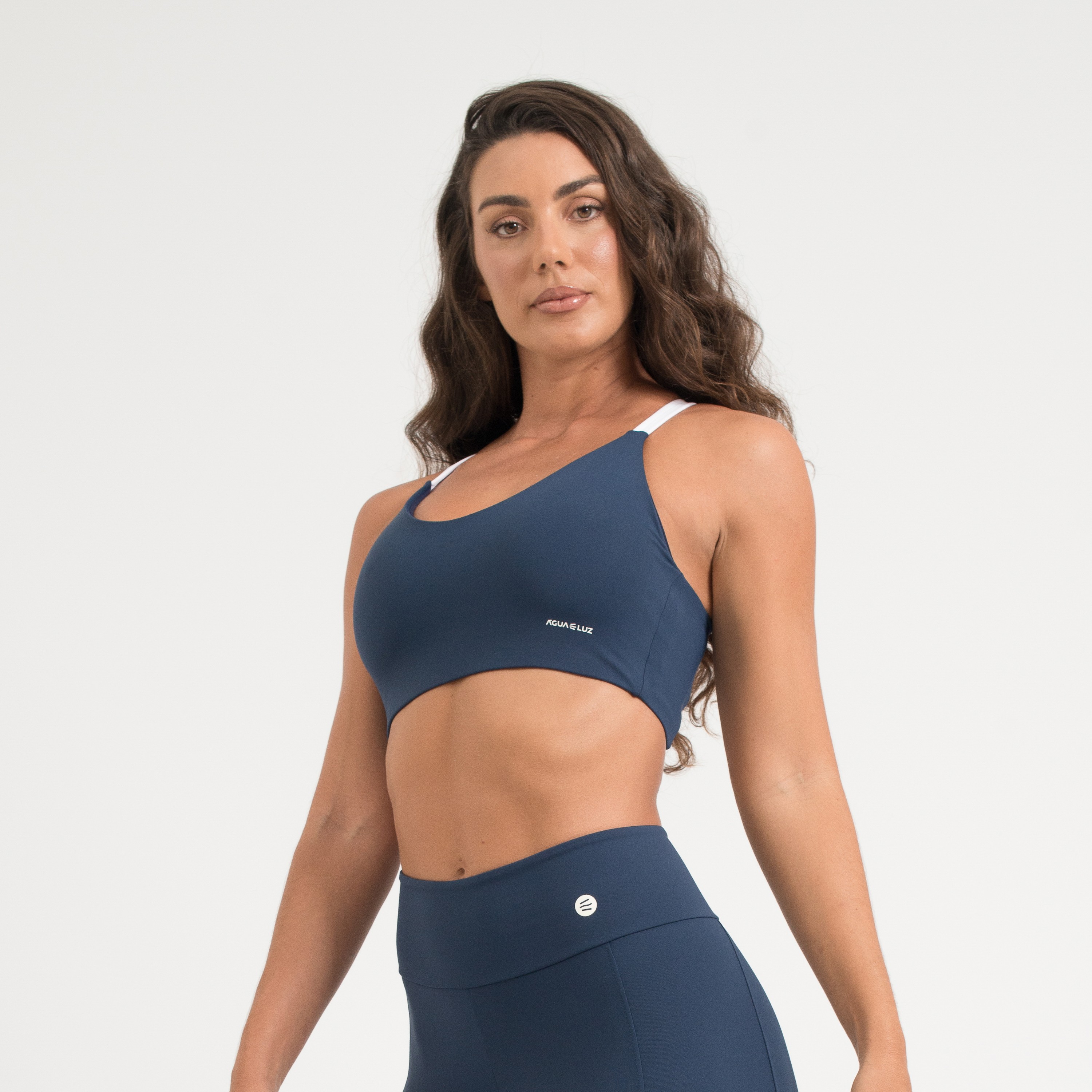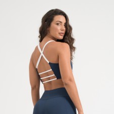 Top fitness confeccionado em poliamida Comfort de alta qualidade, com toque macio, excelente suporte e liberdade total de movimento. Na cor azul marinho, possui alças brancas cruzadas e bojo removível, ideal para treinos ou uso no dia a dia.