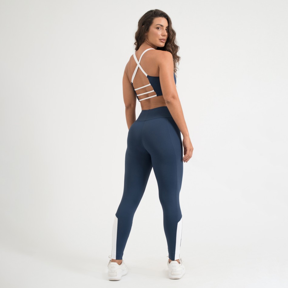 Calça legging fitness confeccionada em poliamida Comfort de alta qualidade, oferecendo toque macio, excelente elasticidade e liberdade total de movimento. Na cor azul marinho, possui recorte branco lateral que valoriza a silhueta, ideal para treinos ou uso no dia a dia.