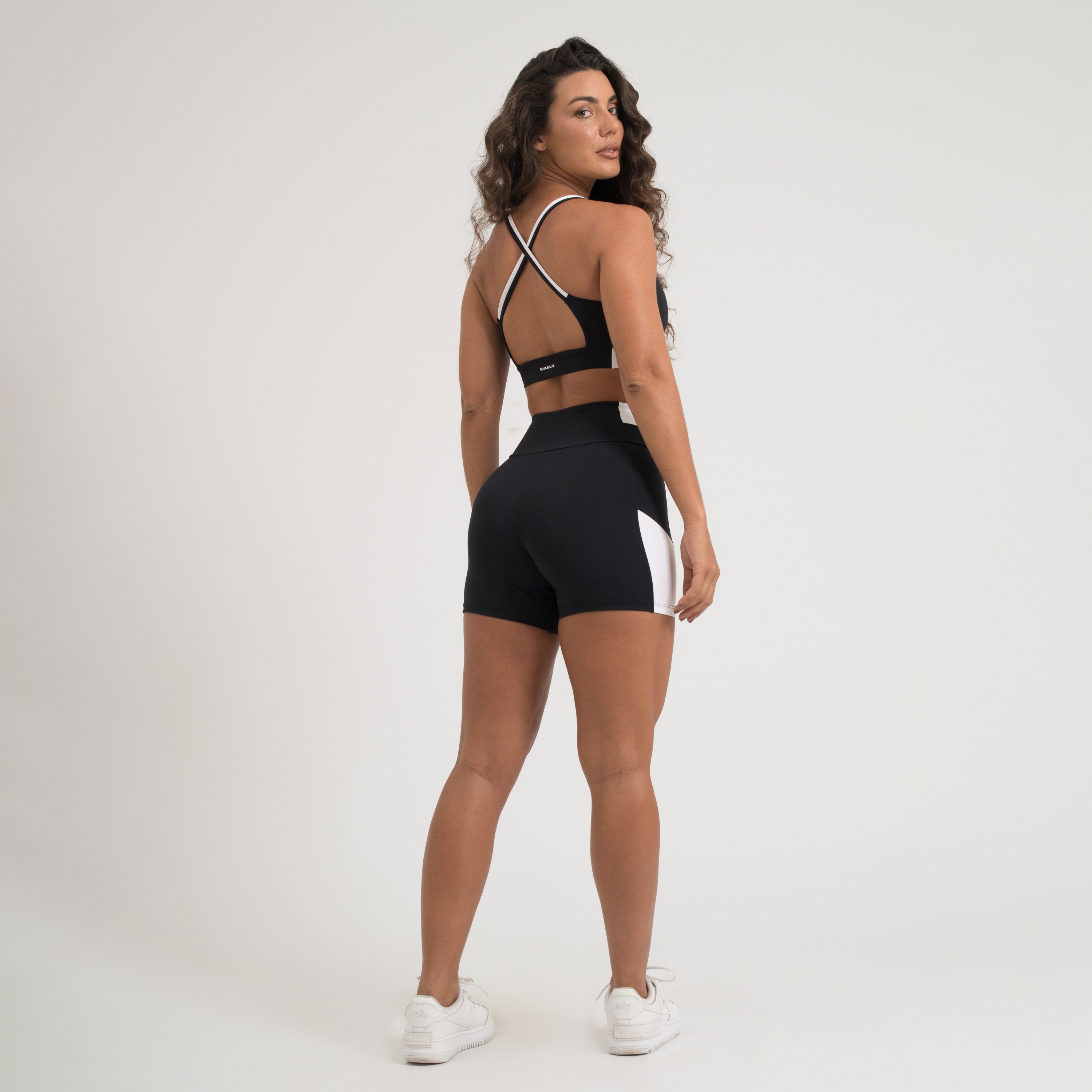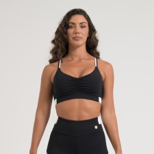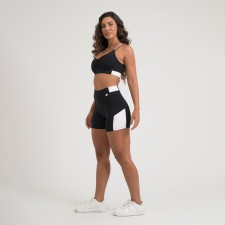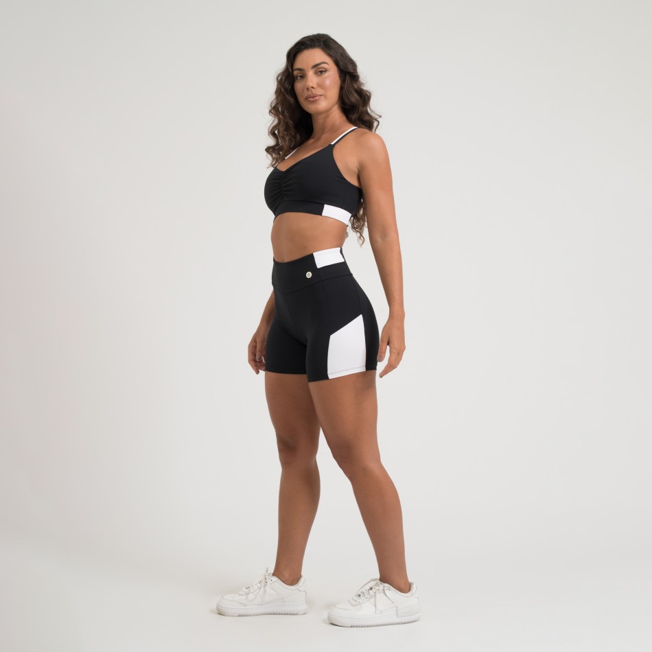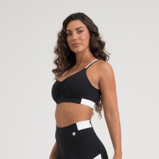 Top fitness confeccionado em poliamida de toque macio e gelado, com excelente elasticidade e conforto ao vestir. Na cor preta, possui alças finas cruzadas, recortes laterais em preto e branco e bojo removível, ideal para o dia a dia ou atividades físicas.