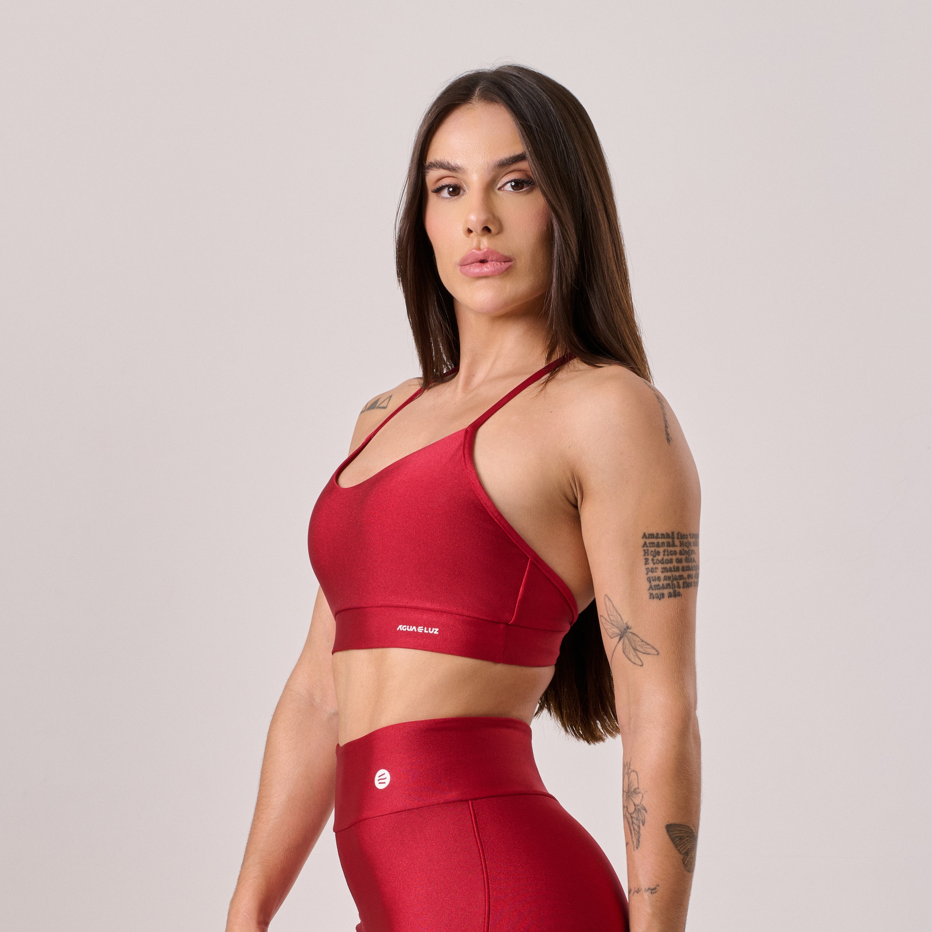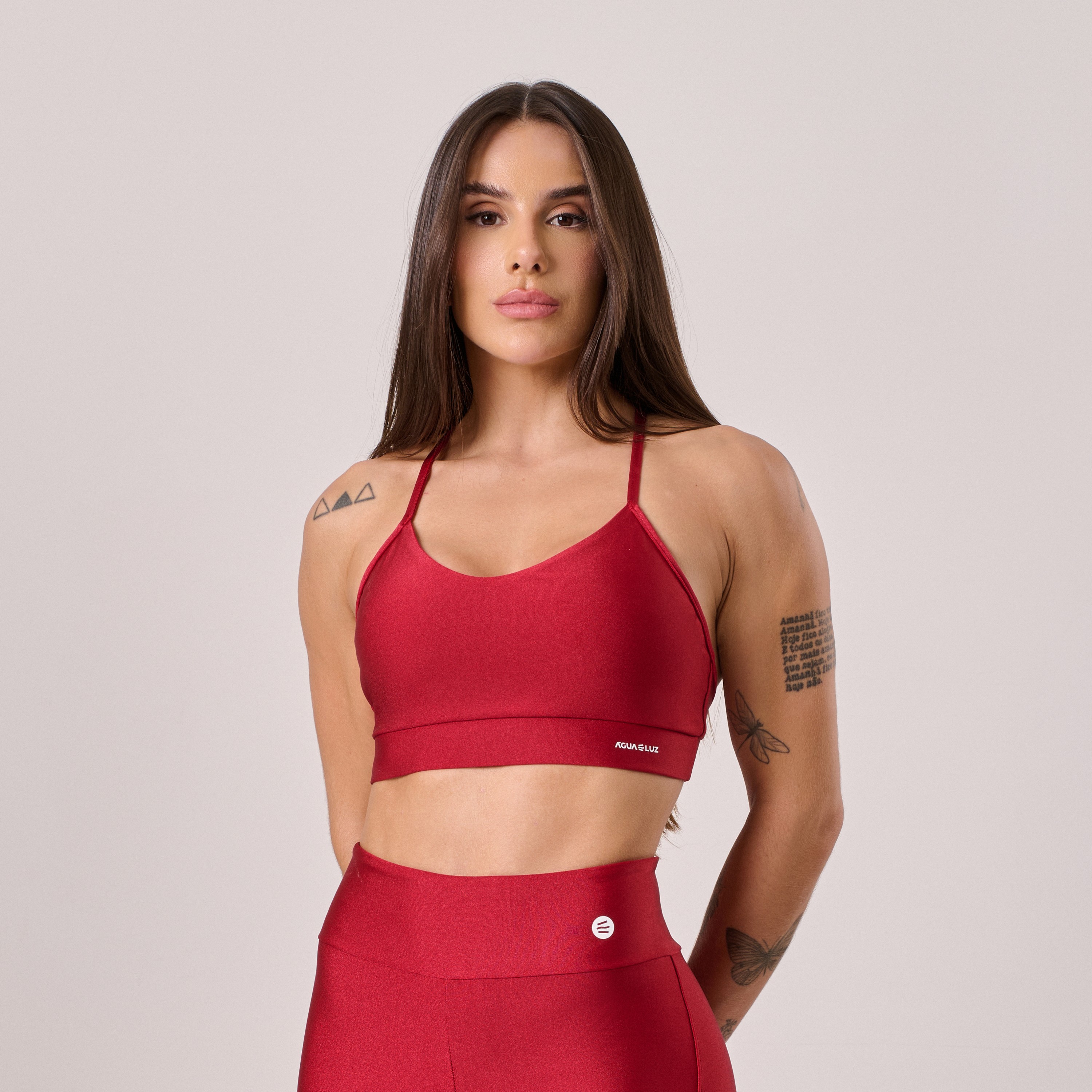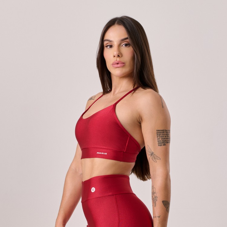 Top confeccionado em poliamida de alta qualidade, com alças cruzadas nas costas que garantem firmeza, sustentação e um toque moderno ao visual. Possui bojo removível, oferecendo versatilidade e conforto para diferentes tipos de corpo.