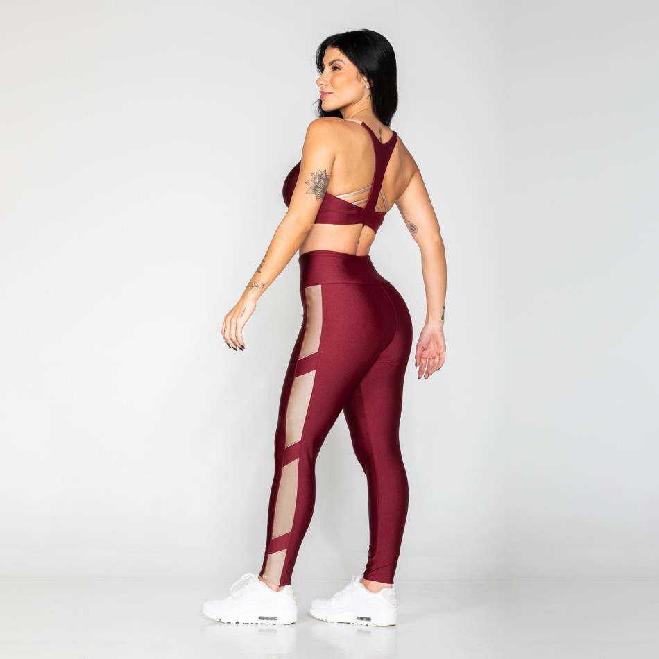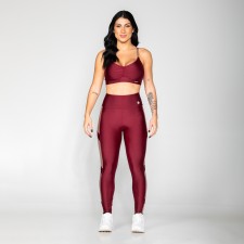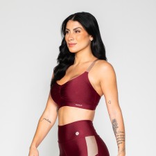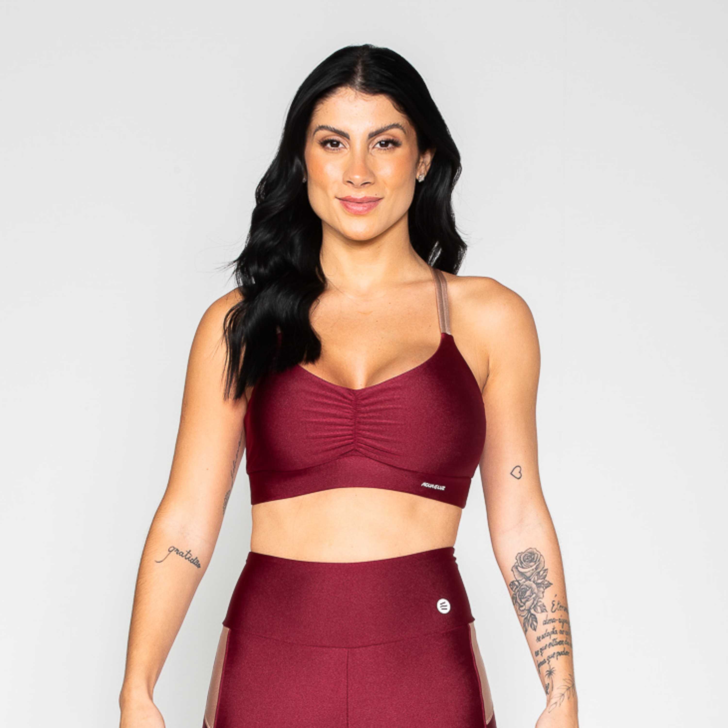Top fitness confeccionado em poliamida vermelha cereja com leve brilho, oferecendo compressão, segurança e ajuste perfeito ao corpo. Possui modelo nadador com franzido frontal, alças duplas, bojo removível e detalhe em tiras nude nas costas, garantindo sustentação e estilo para treinos ou uso diário.