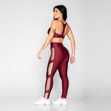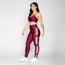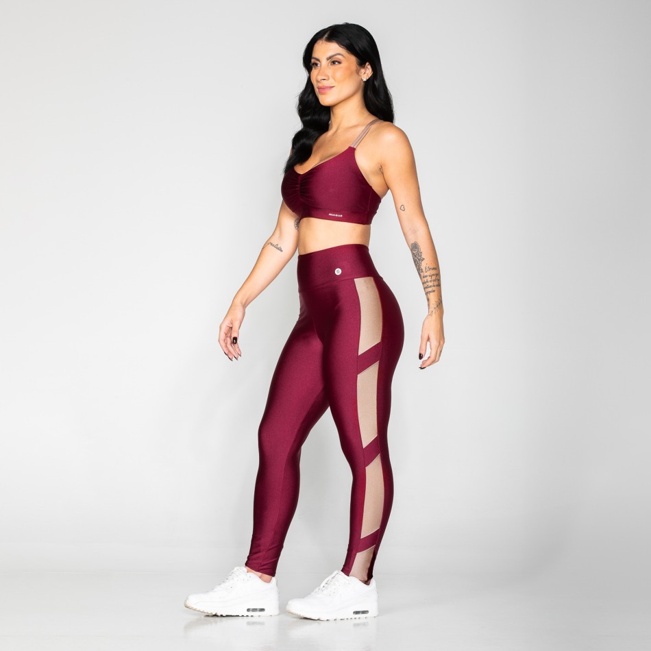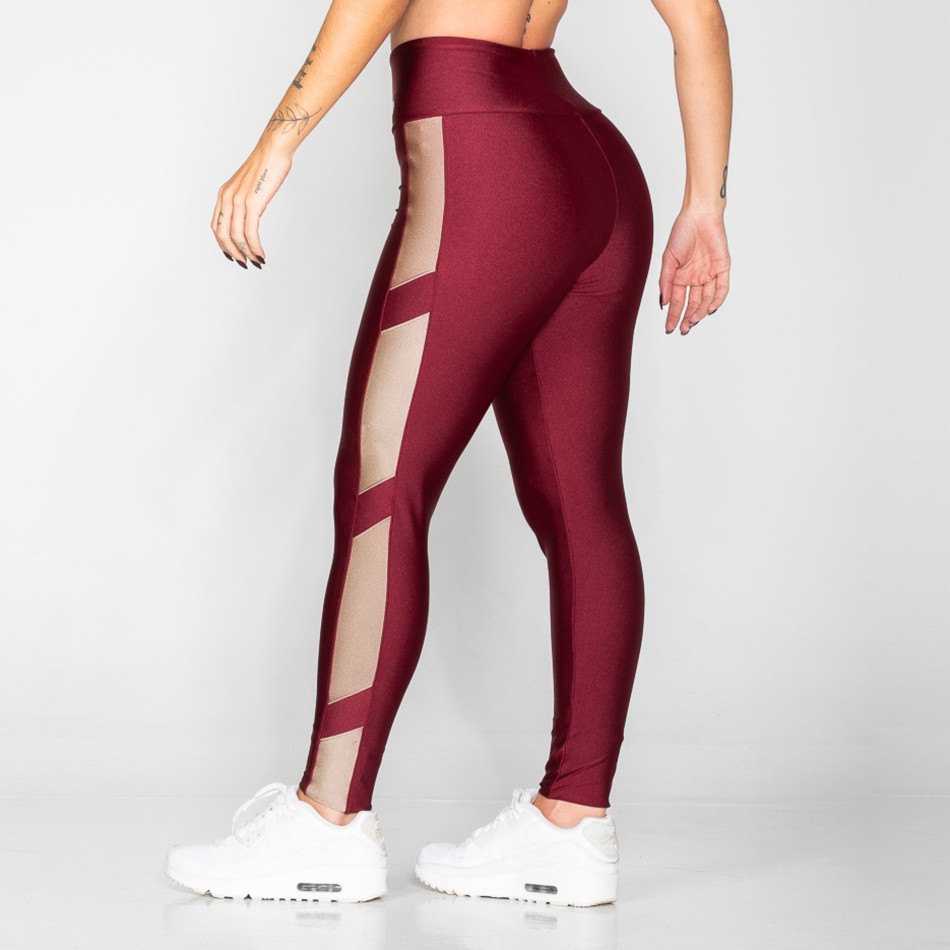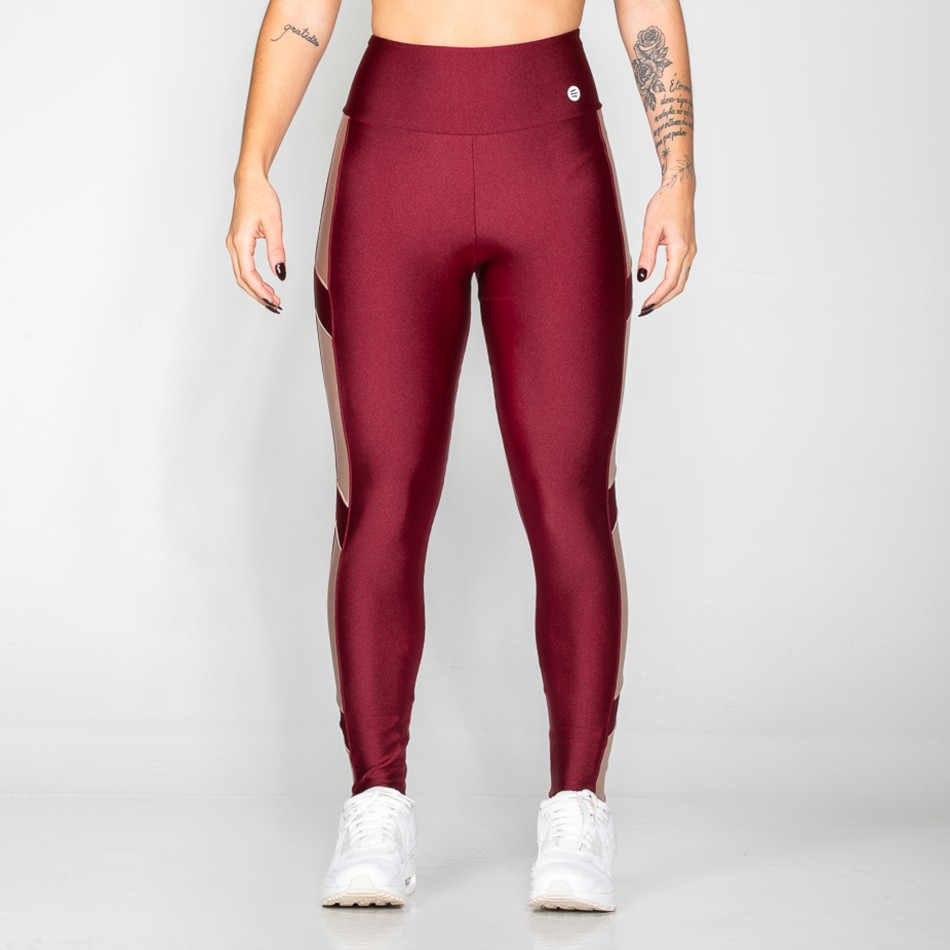 Calça legging fitness confeccionada em poliamida com leve brilho, oferecendo compressão, alta cobertura e excelente gramatura para maior segurança ao vestir. Na cor vermelho cereja, possui cós alto modelador e recortes laterais em nude que alongam a silhueta, ideal para treinos ou uso no dia a dia.