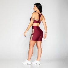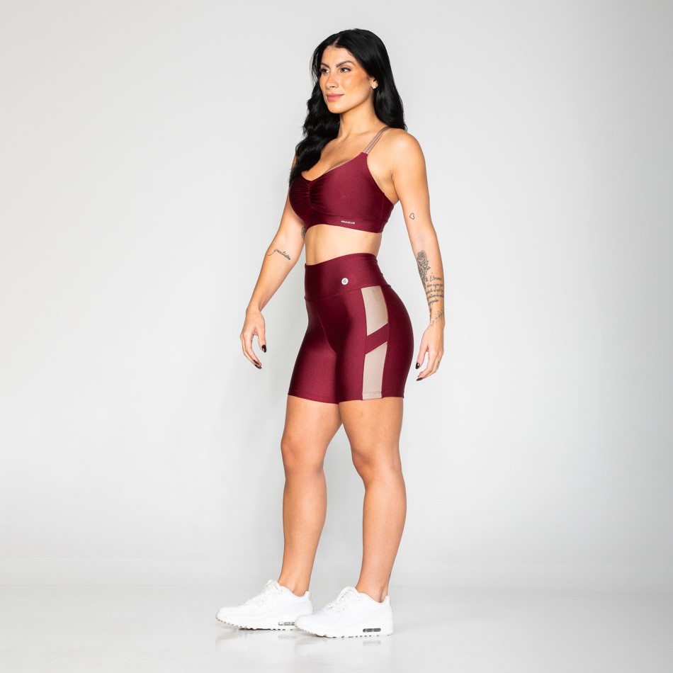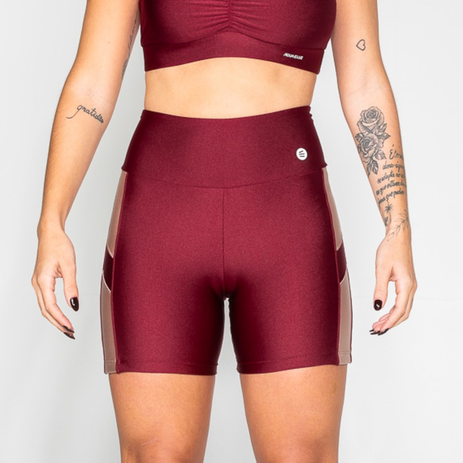 Short fitness confeccionado em poliamida com leve brilho, oferecendo compressão, alta cobertura e excelente gramatura para maior segurança ao vestir. Na cor vermelho cereja, possui cós alto modelador e recortes laterais em nude, ideal para treinos ou uso no dia a dia.