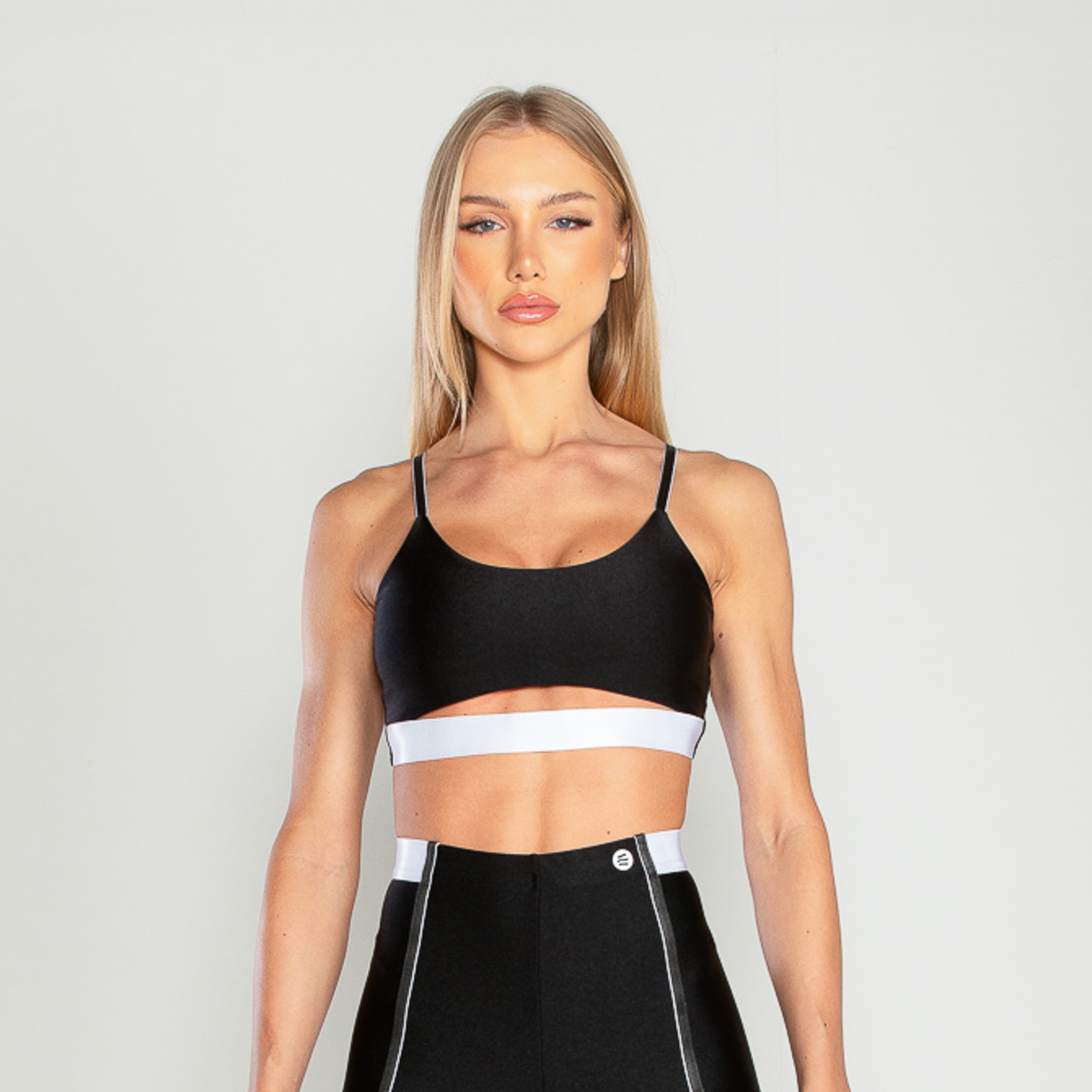 Top fitness vazado confeccionado em poliamida preta com leve brilho, oferecendo compressão e ajuste seguro ao corpo. Possui bojo removível, alças finas reguláveis e elástico branco, garantindo conforto, sustentação e estilo para treinos ou uso diário.