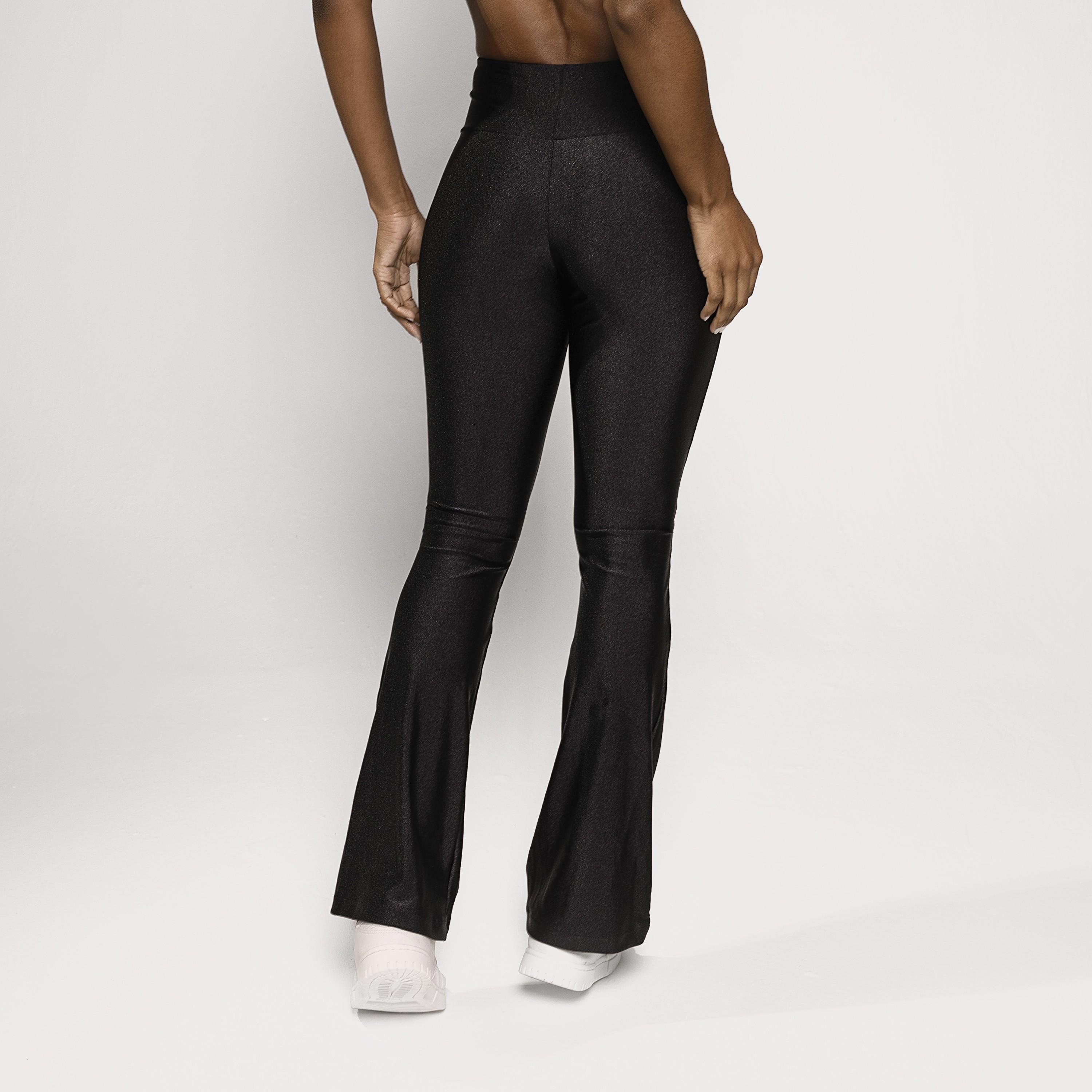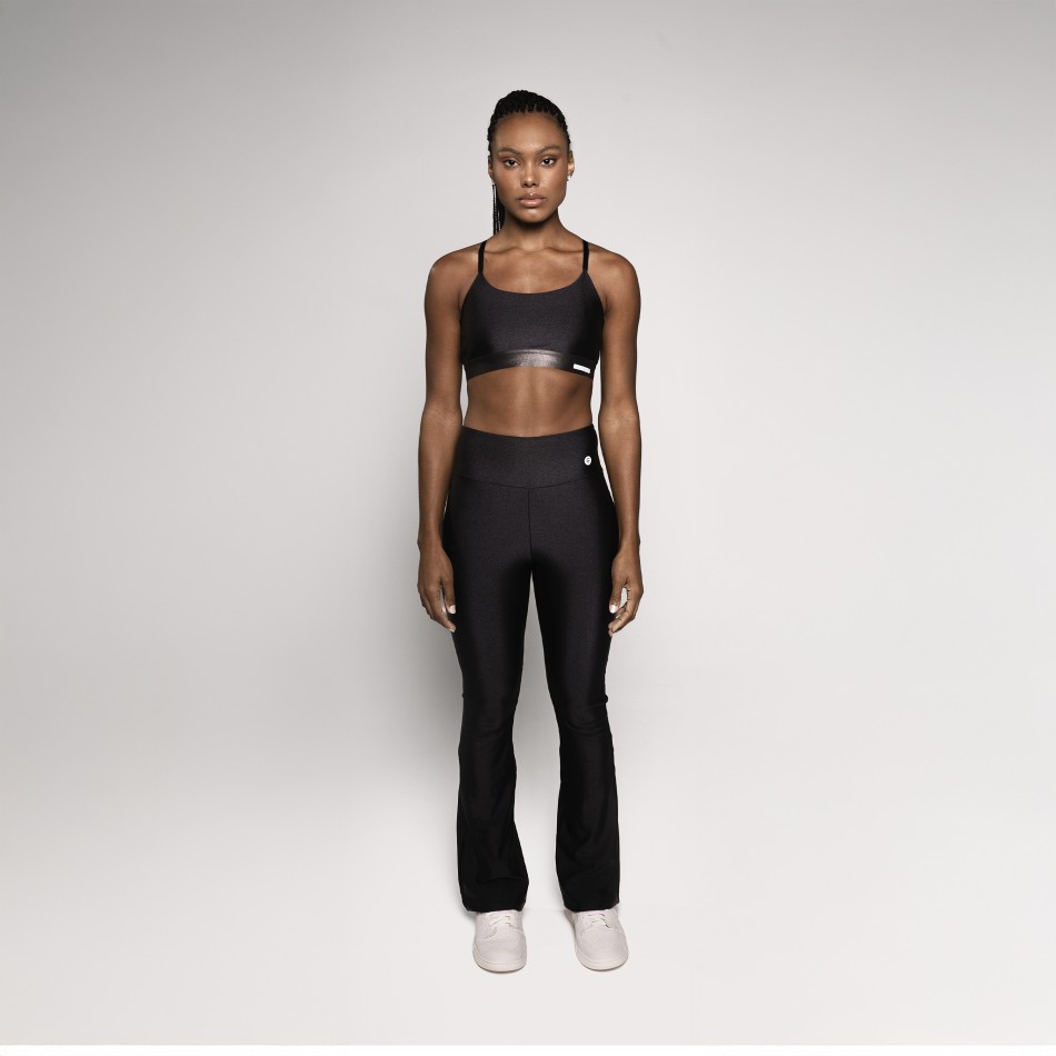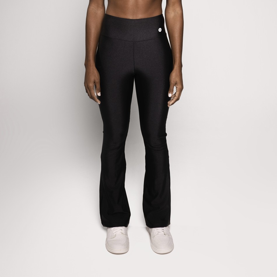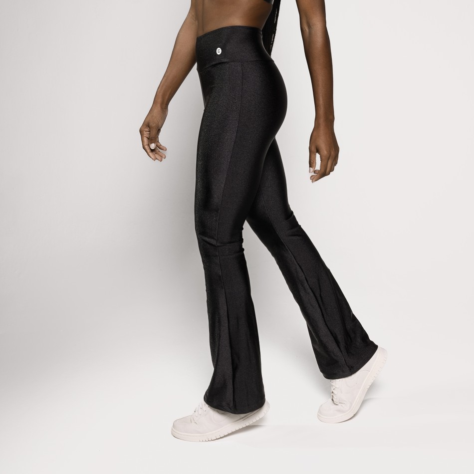 Calça flare confeccionada em poliamida preta com brilho, uma peça que une conforto, estilo e versatilidade em um design atemporal. A modelagem flare alonga a silhueta e traz um visual moderno e elegante, ideal para quem busca sofisticação sem abrir mão do conforto.