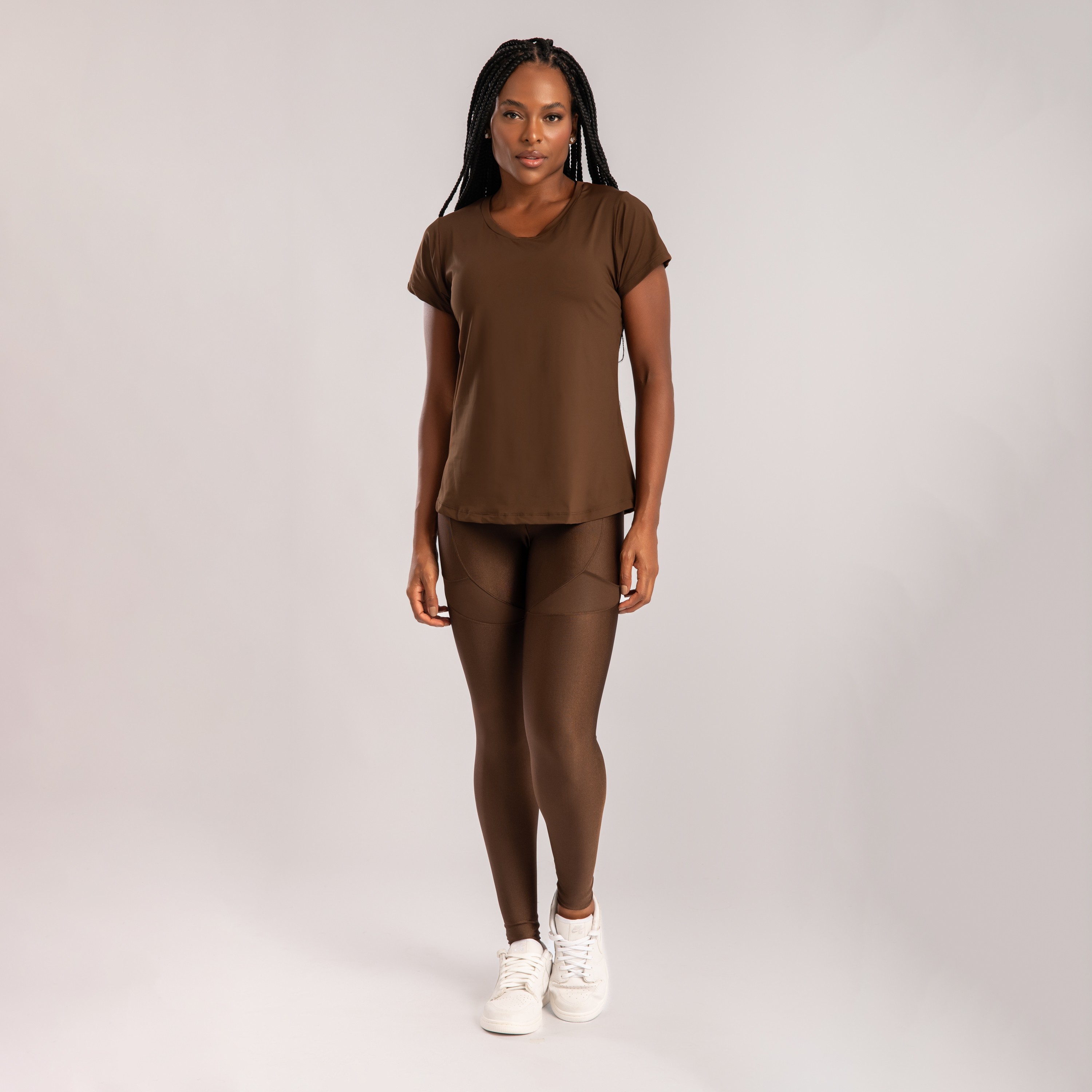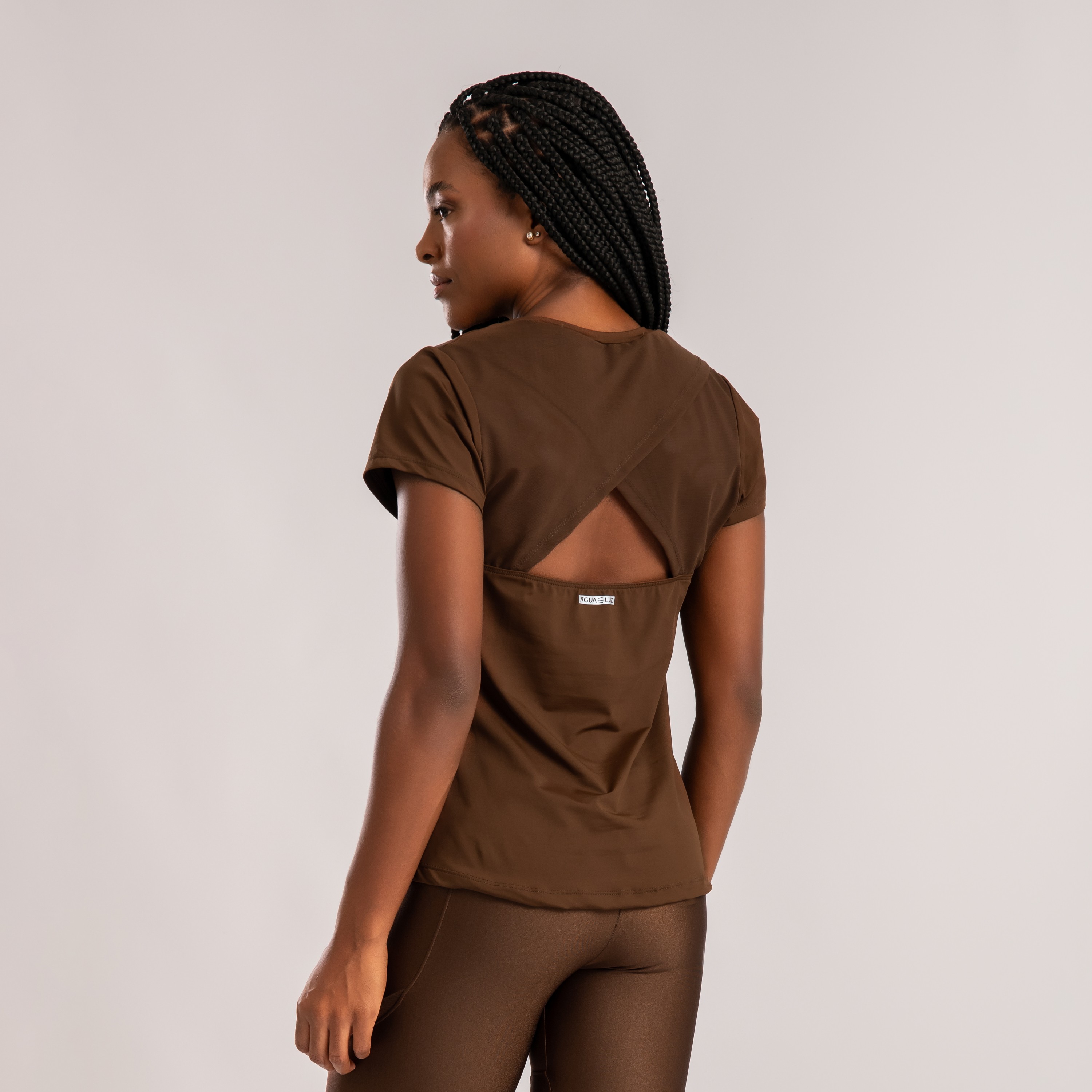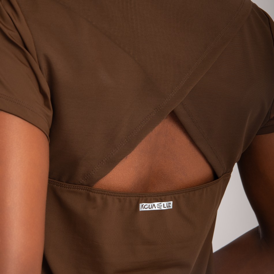 Camiseta confeccionada em poliamida na cor marrom café, leve, confortável e cheia de personalidade. Com toque macio e caimento impecável, a peça proporciona bem-estar durante todo o uso. O destaque fica por conta do detalhe em tule com efeito transpassado nas costas, que garante maior respirabilidade e adiciona um visual moderno e sofisticado ao design.
