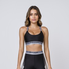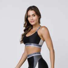 Top com bojo removível confeccionado em lycra de poliamida preta, com brilho sofisticado e acabamento impecável. Desenvolvido para oferecer ajuste firme e confortável ao corpo, é ideal para acompanhar seus movimentos com segurança no dia a dia ou nas atividades físicas.