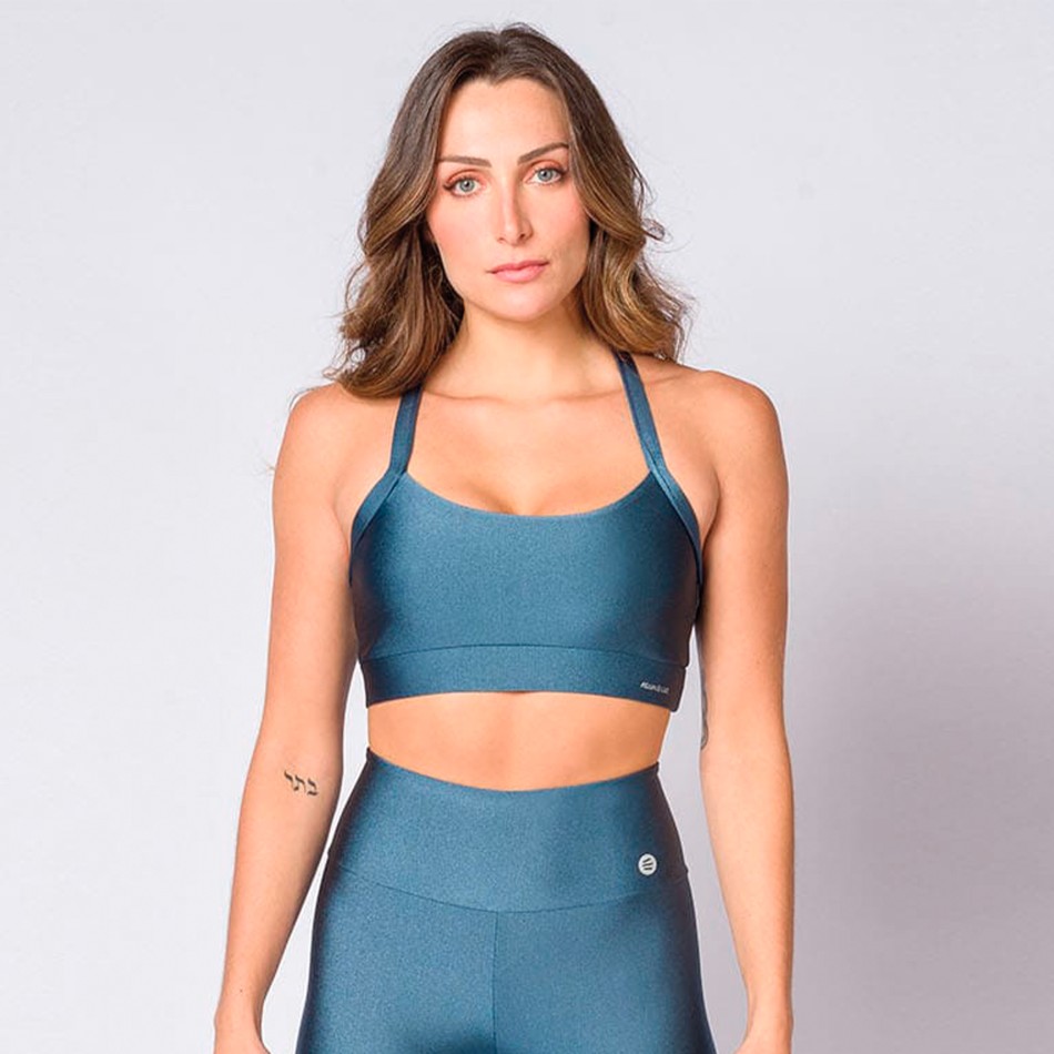 O top sem bojo em poliamida azul porcelana combina conforto, qualidade e beleza em uma única peça. Confeccionado em lycra de toque macio e brilho elegante, oferece ajuste confortável e excelente elasticidade. As alças cruzadas e o design diferenciado nas costas adicionam charme e personalidade ao visual, tornando o top ideal para treinos ou composições fitness cheias de estilo. Uma peça indispensável para quem valoriza funcionalidade e estética.