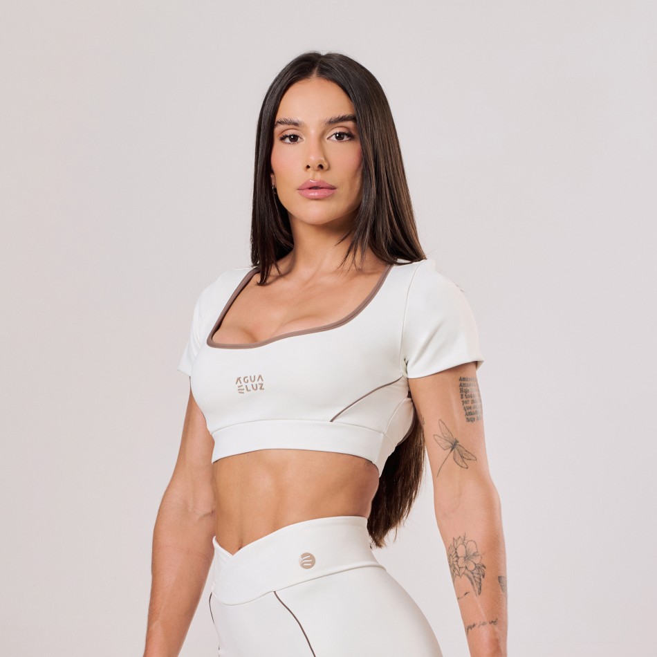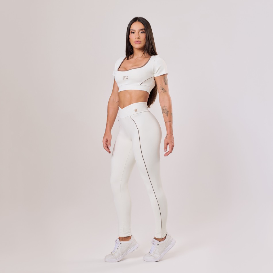 O Top de Manga Off White com Friso Castanho combina sofisticação e conforto em uma peça versátil. Confeccionado em tecido macio e com ótima elasticidade, garante liberdade de movimentos. O tom off white traz leveza, enquanto o friso castanho adiciona um contraste moderno e elegante, ideal para looks fitness ou casuais.