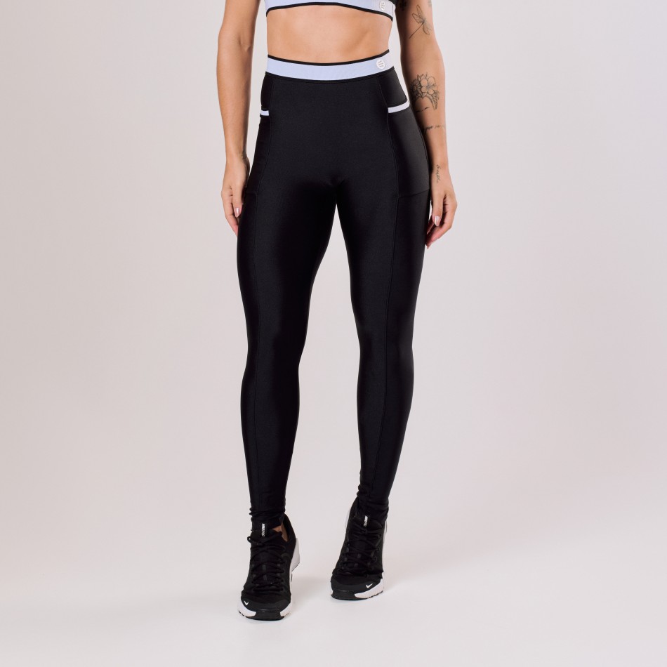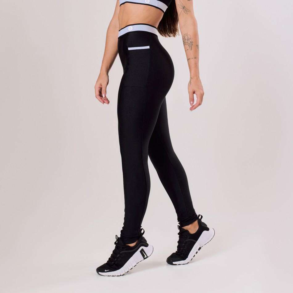 A Calça Legging Preta com Bolso e Elástico Branco une praticidade e estilo em um design moderno. O bolso funcional traz mais comodidade para o dia a dia, enquanto o elástico branco cria um contraste elegante e garante ajuste confortável ao corpo.