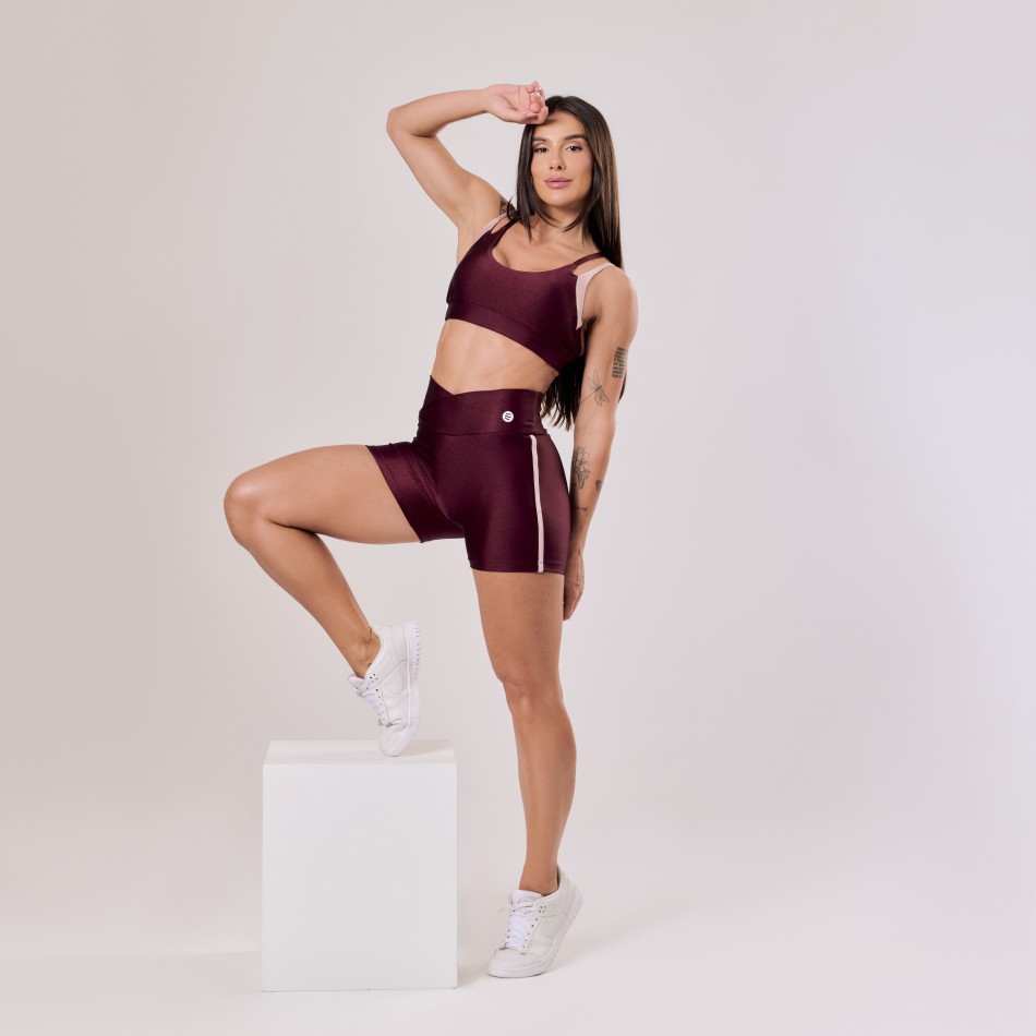 O Short vinho com Cós Transpassado e Detalhe Rose traz um visual moderno e elegante, valorizando a silhueta com delicadeza. O cós transpassado adiciona um design diferenciado, enquanto o detalhe rosé garante um toque sofisticado à peça.