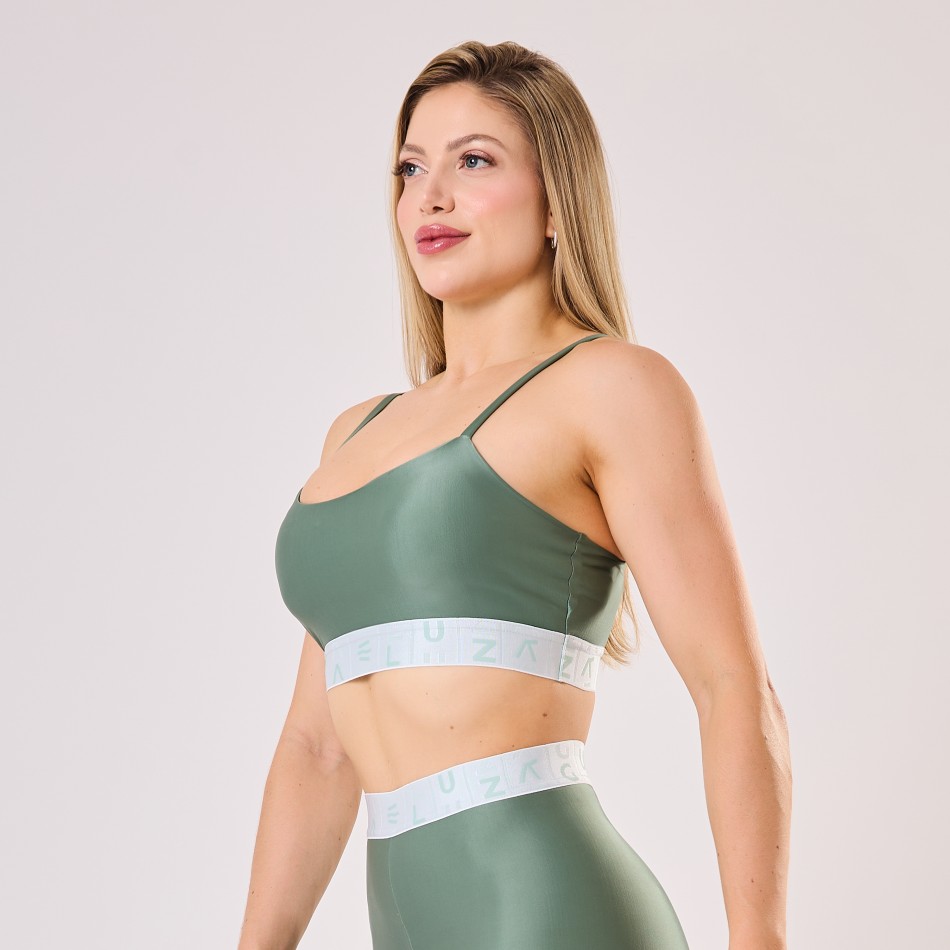 Top Verde Eucalipto com elástico personalizado branco Água e Luz, moderno e sofisticado. A combinação do verde suave com o elástico branco cria um contraste elegante e atual. Possui modelagem confortável que valoriza o corpo, ideal para treinos ou para compor looks fitness cheios de estilo. OBSERVAÇÕES: