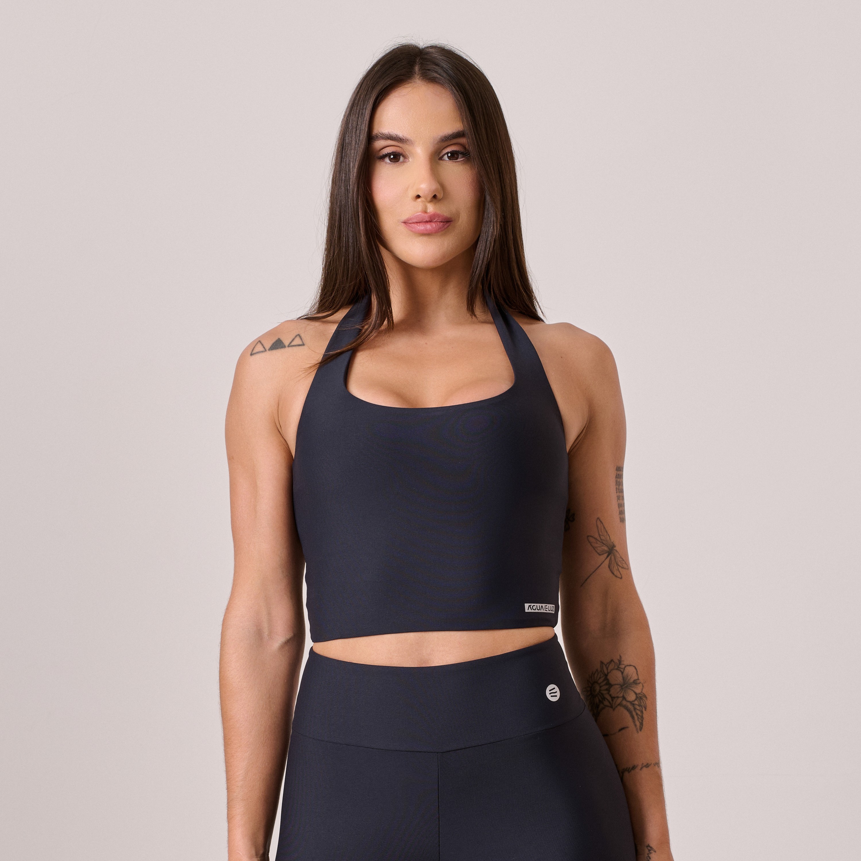 Cropped decote reto poliamida Comfort preto. Minimalista, elegante ,confortável, é perfeito para quem busca liberdade de movimento sem abrir mão do estilo.