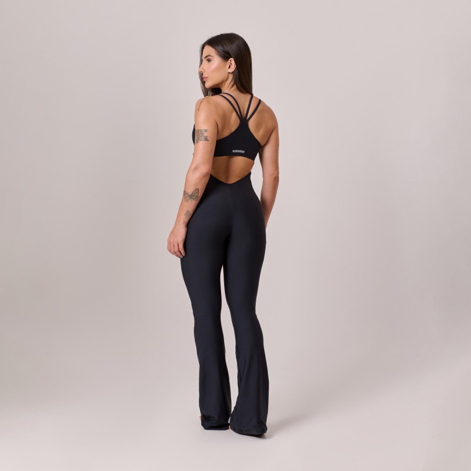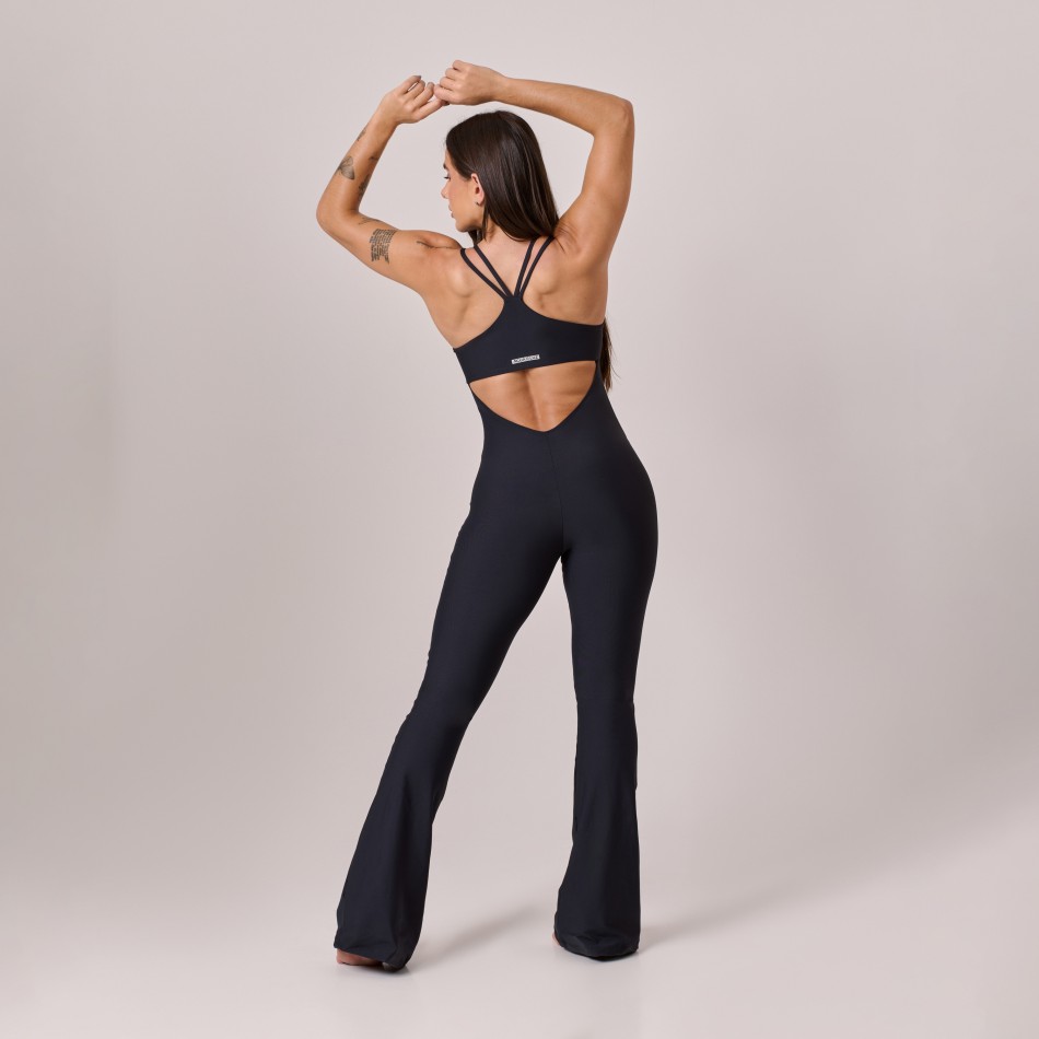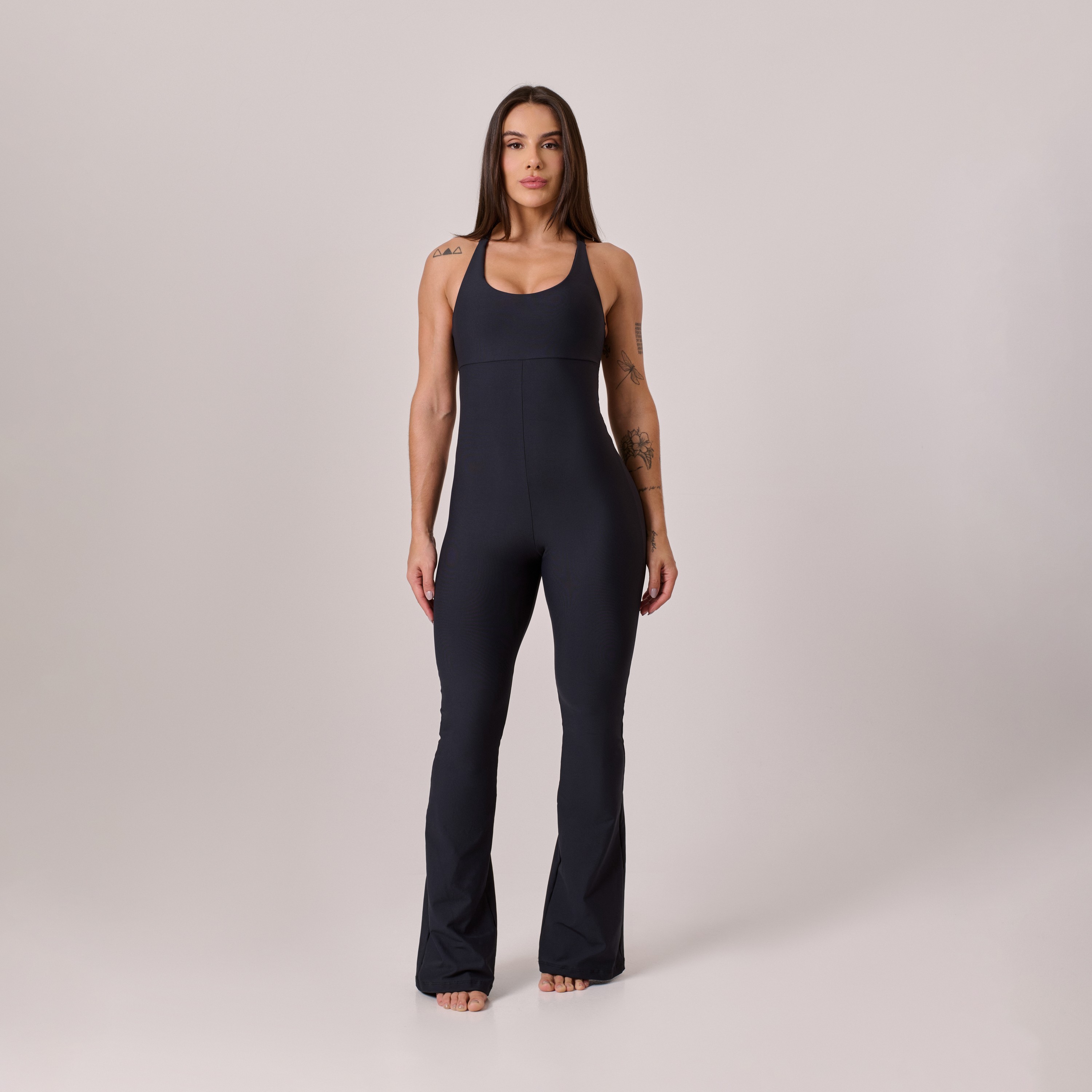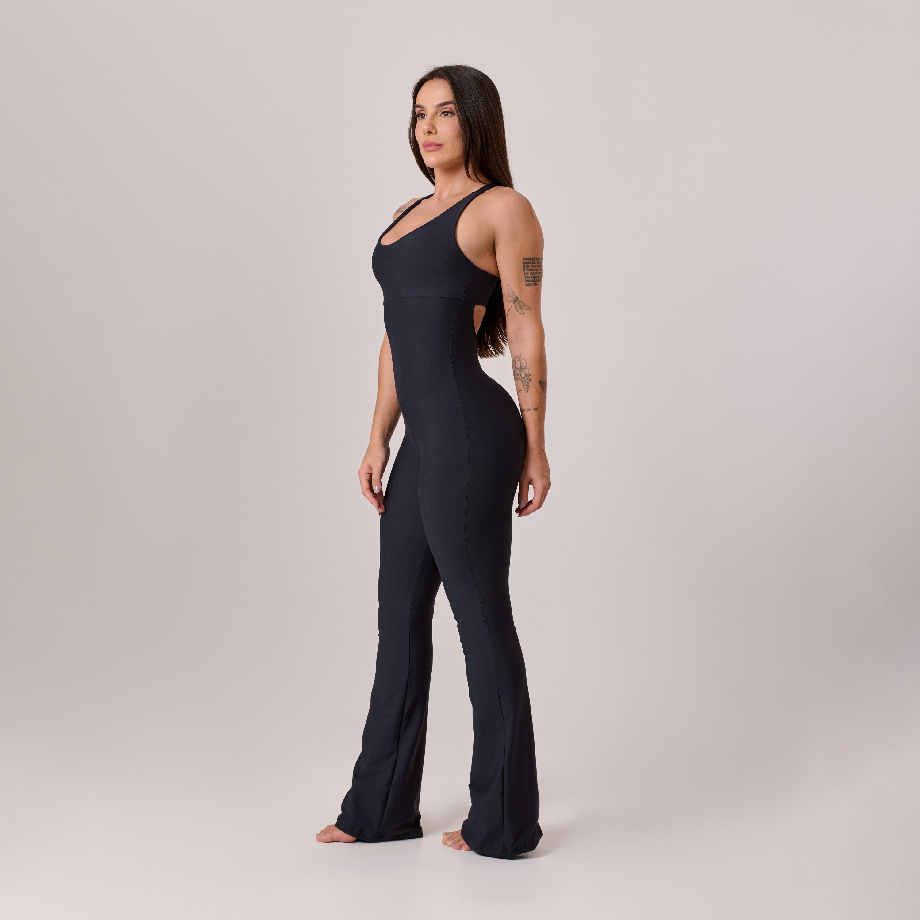 Macacão Flare Poliamida Comfort Preto Elegante, leve e cheio de conforto, é perfeito para quem busca movimento livre com estilo minimalista.