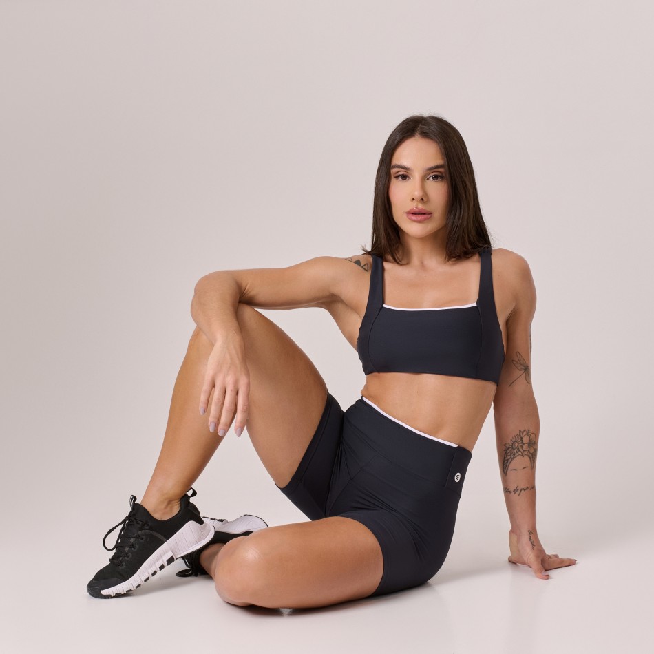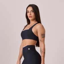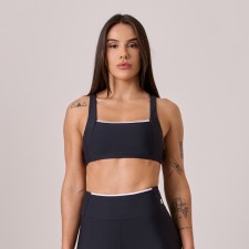 Top decote reto confeccionado em poliamida Comfort, na cor preta com detalhe branco, que traz um toque moderno e elegante ao visual. O tecido possui alta elasticidade, toque macio e secagem rápida, proporcionando máximo conforto e liberdade de movimento.