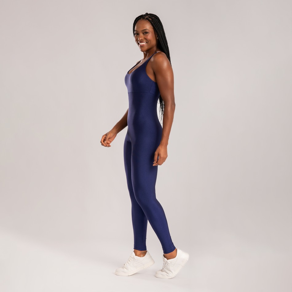 O macacão em poliamida azul marinho possui modelagem que valoriza o corpo, toque macio e elasticidade natural.