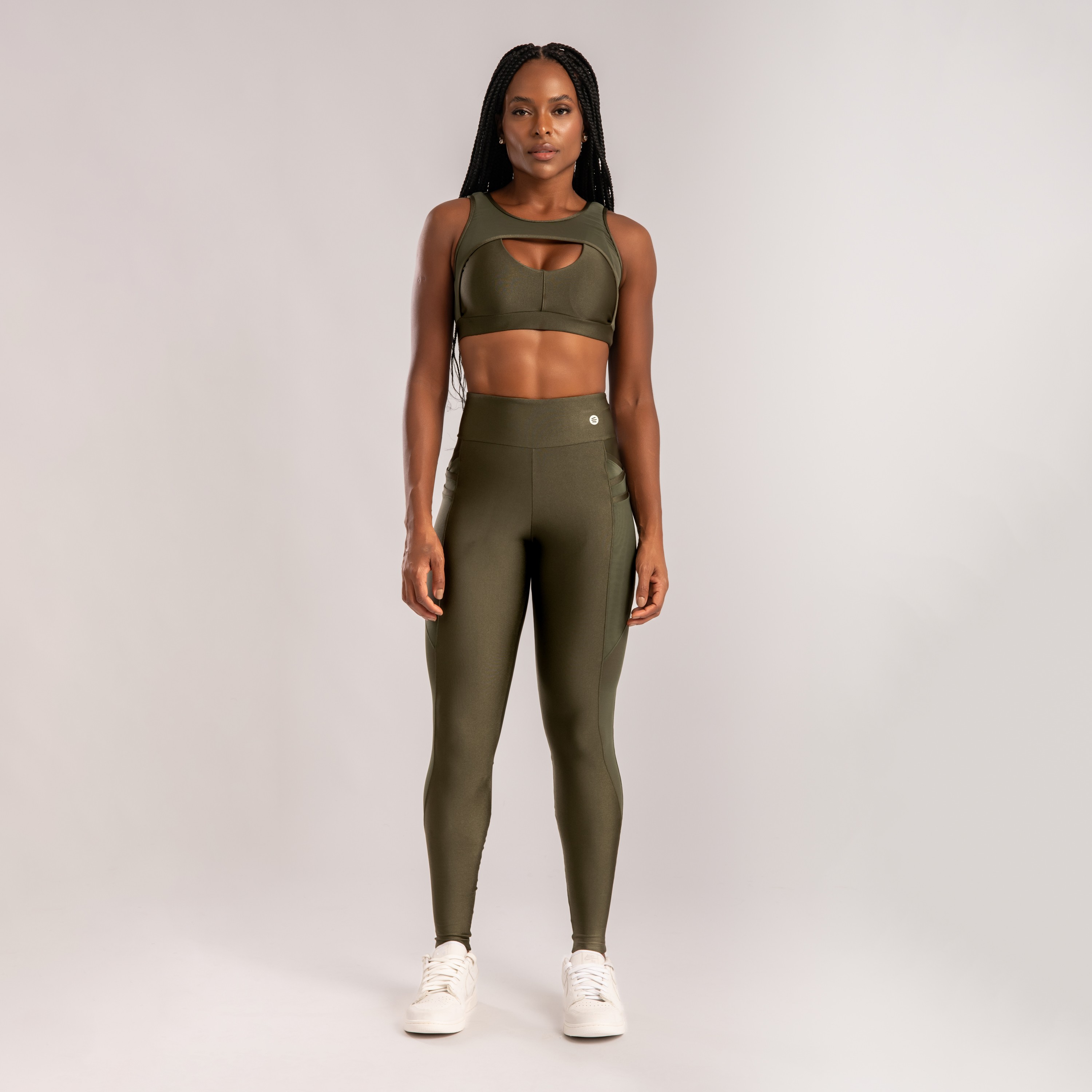 Calça legging em poliamida na cor verde escuro, com bolso triplo em tule que une funcionalidade e design moderno. Confeccionada em poliamida de toque macio, oferece excelente elasticidade, conforto e alta sustentação, acompanhando os movimentos com segurança. Ideal para treinos, caminhadas ou para compor looks urbanos cheios de atitude.
